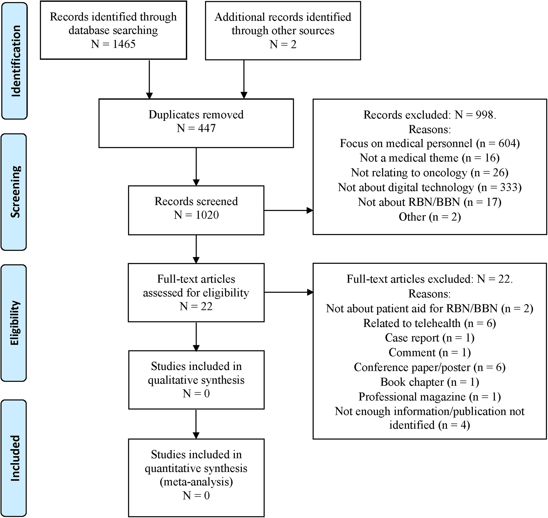 Based on the stepwise exclusion procedure, 998 articles were excluded (see Figure 1). Of these, 604 articles were found to focus exclusively on healthcare professionals, 16 did not relate to medicine, 26 did not relate to oncology, 333 made no reference to digital technology, 17 made no mention of RBN or BBN, and 2 publications were excluded because the abstract contained no information. This procedure resulted in 22 articles reaching full-text screening in the second step of the study selection process. After full text screening, we excluded all 22 of these articles because they failed to meet any of the inclusion criteria (see Supplementary Table 2 for a summary of excluded articles and reasons for exclusion as well as Figure 1 for these reasons).