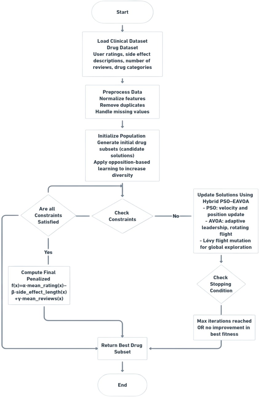 A Hybrid PSO–EAVOA exploratory optimization framework was implemented on a multi-criteria drug selection problem, which was structured as a combinatorial optimization problem that combined the impact of drugs’ therapeutic effects, safety concerns and collective feedback from users. The data was collected from Kaggle's open-source drug review repository and contained granular records of drug ratings, side-effect profiles, and number of user reviews, giving a representative and varied search space for our optimization. As a complete set of preprocessing steps were implemented to ensure this data was reliable and accessible for the algorithm, data preprocessing involved removing non-informative attributes, complete normalization of drug ratings and review counts, quantifying side-effect text descriptors, and encoding categorical attributes. The combination of these steps enabled a unique modeling of drug prioritization, and offered priority based on balancing both efficacy and safety.