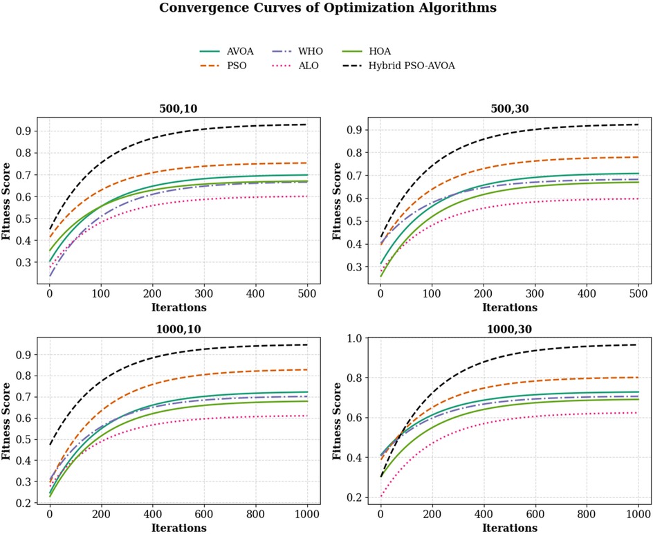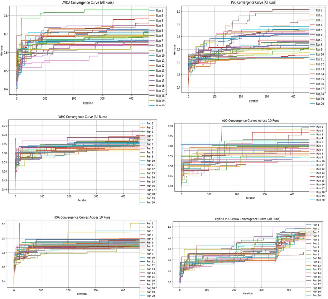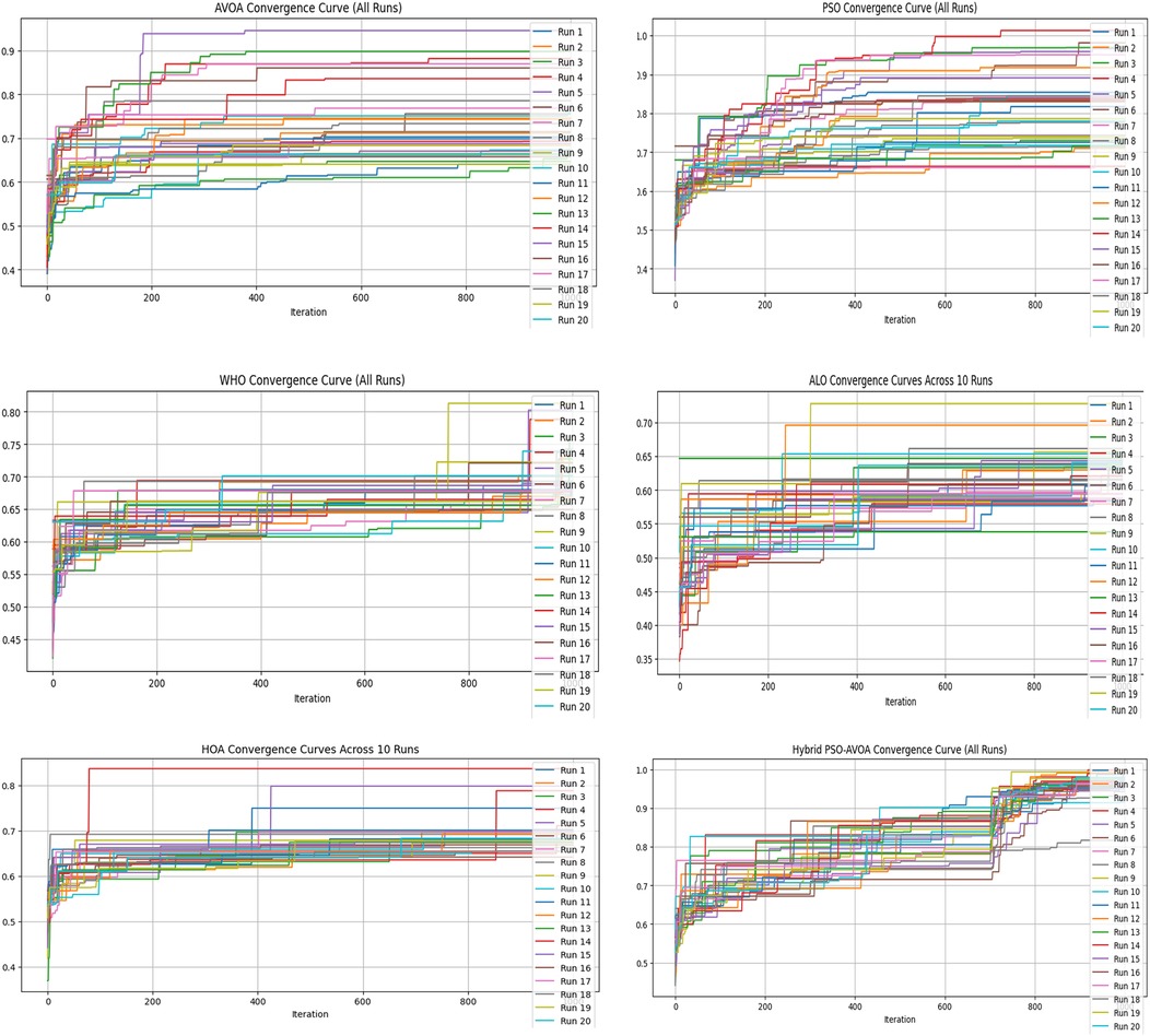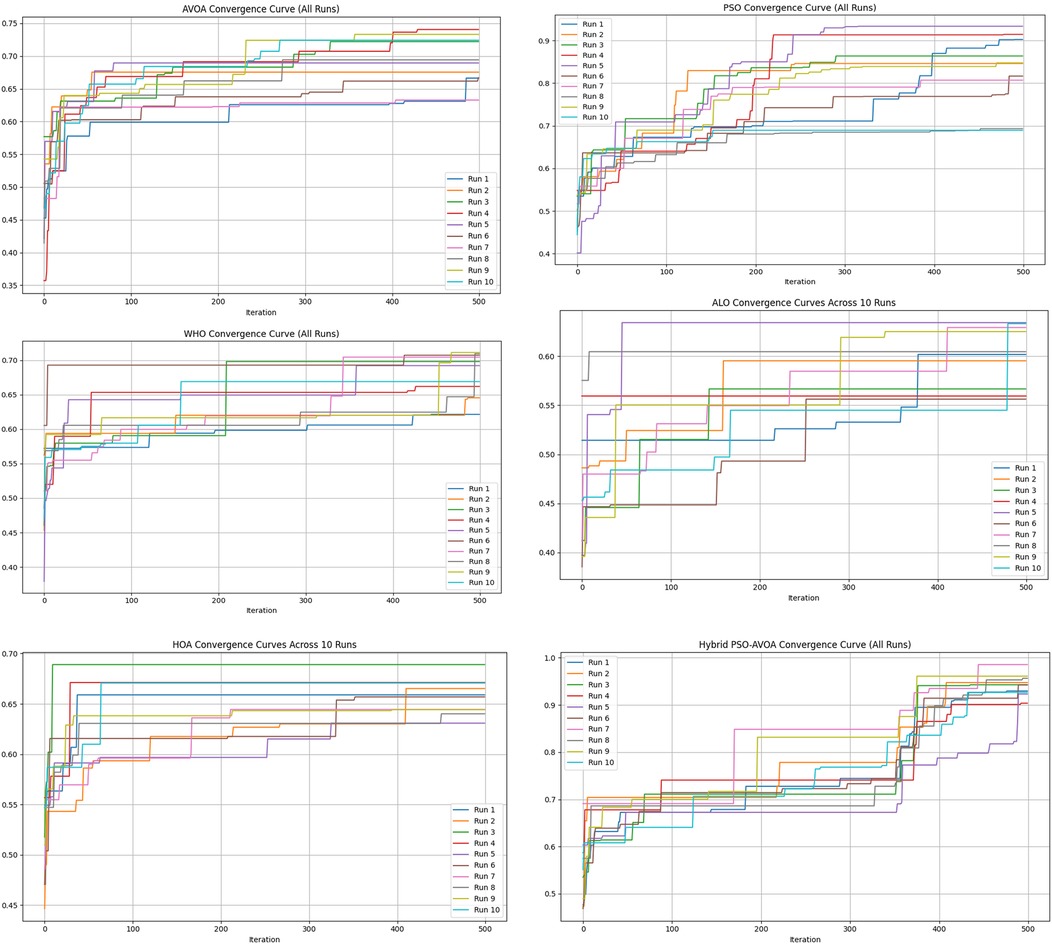 Figures 2–5 illustrate the convergence performance of all algorithms evaluated on the 500-iteration and 1,000-iteration test sets, each of which was examined over 10-iteration and 30-iteration runs to ensure stability and reliability. The proposed hybrid PSO–EAVOA demonstrated fast initial convergence, followed by steady refinement in later iterations, effectively maintaining speed and avoiding the premature stagnation observed in PSO and WHO. In comparison, both ALO and HOA were slower explorers and provided suboptimal solutions, while EAVOA performed moderately, but did not provide stability across multiple runs. The superior behaviour of the hybrid model is attributed to its adaptive exploration–exploitation strategy, where dynamically tuned inertia weights and acceleration coefficients preserve diversity among populations. Additionally, perturbations were based on Levy Flights, providing restricted stability that permitted efficient global exploration and movement away from a local optimum, as well as retaining the best performing candidates, enabling elite solution protection that allowed EAVOA to converge more quickly, while providing improved robustness overall.