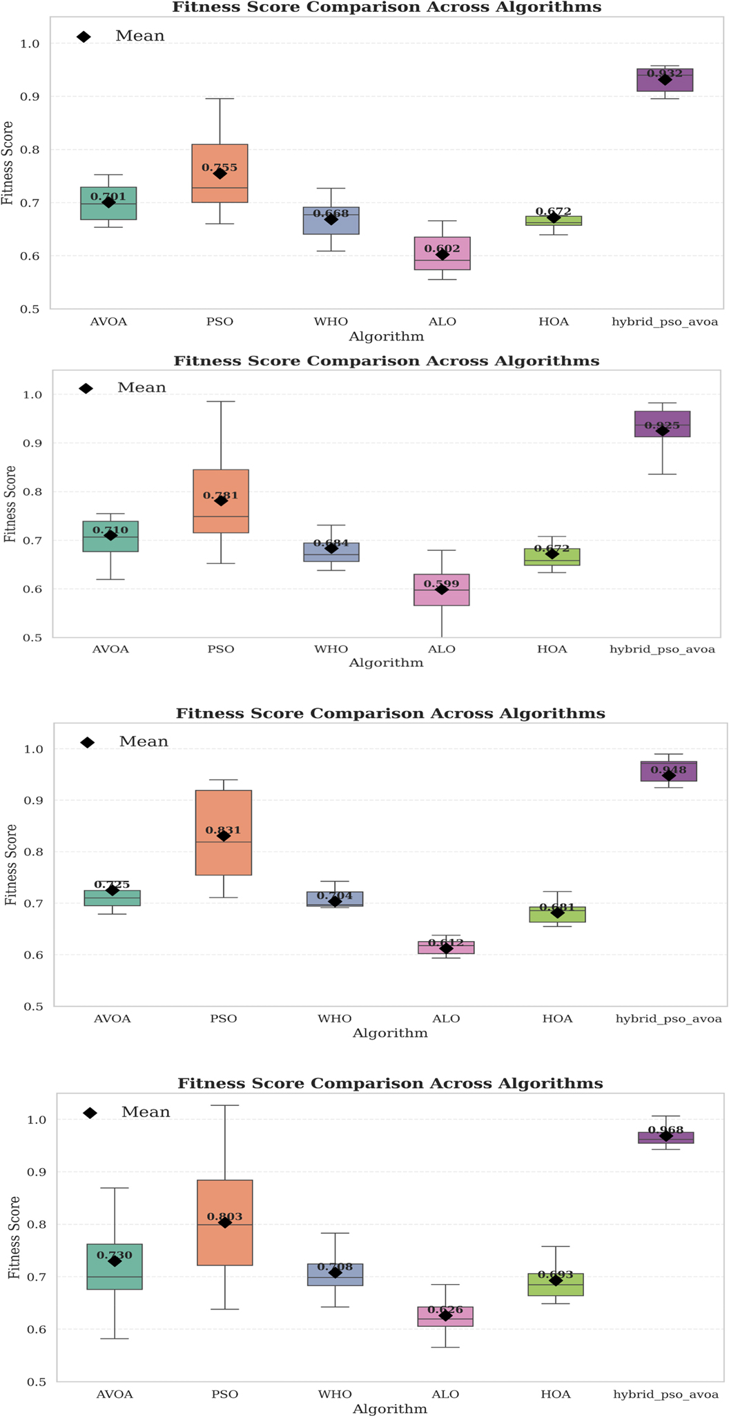 Figure 7 provides box plots of the fitness score data to provide basic statistical insights regarding the variation across independent runs. The hybrid PSO–EAVOA consistently shows a high average fitness and tight interquartile range, demonstrating superior consistency compared to competing algorithms. PSO has demonstrated high accuracy, though considerable variation, meanwhile ALO and HOA have clearly demonstrated weak robustness and fitness variability.