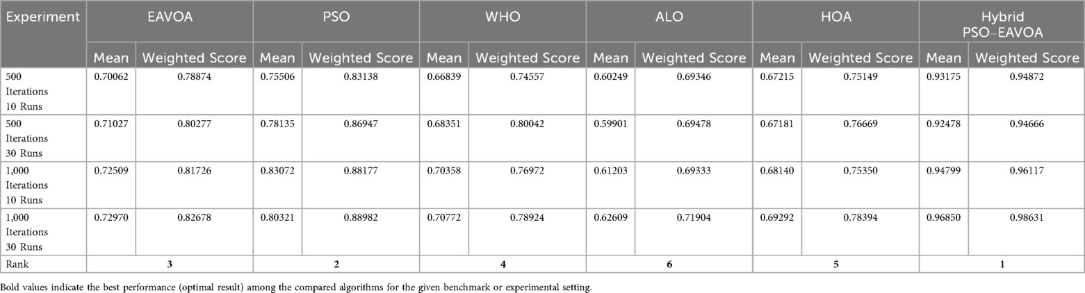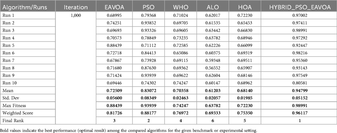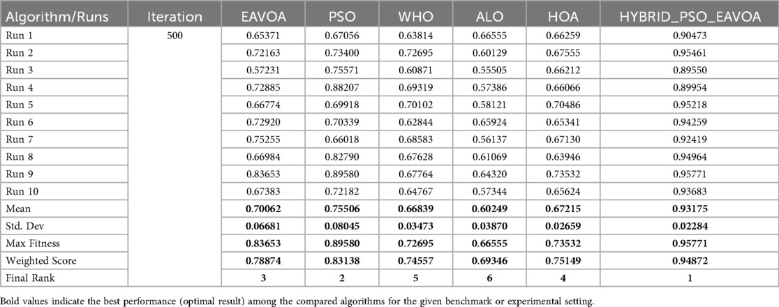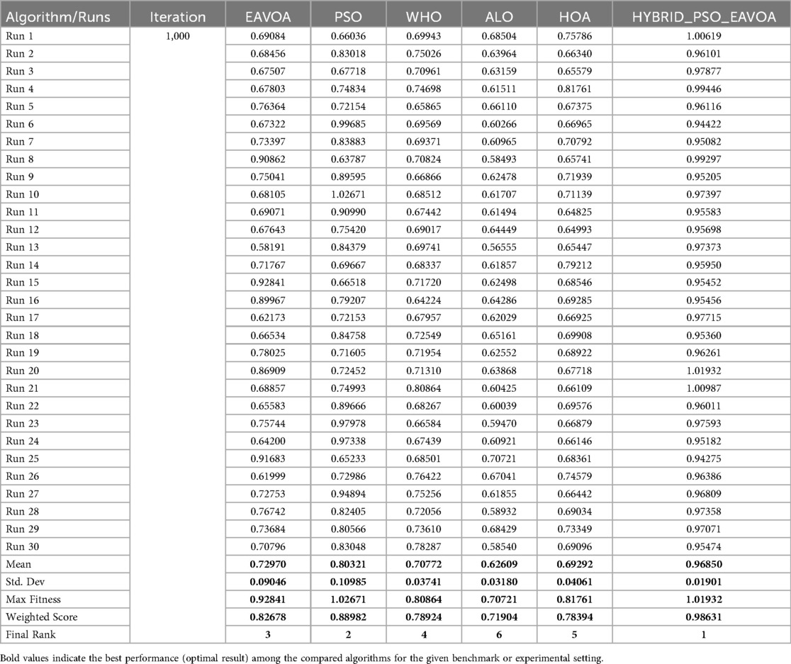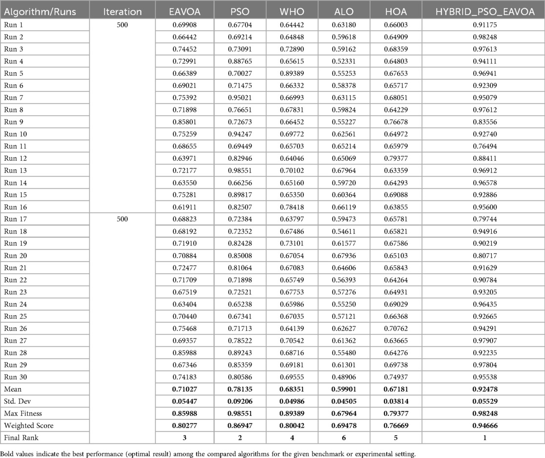 The quantitative evaluation of the proposed hybrid PSO–EAVOA algorithm was conducted using a multi-criteria performance framework to ensure a fair comparison with baseline optimizers including PSO, EAVOA, WHO, ALO, and HOA. The performance measurements were derived from a total of four test set-ups: 500 iterations for metrics such as 10 runs and 30 runs; and 1,000 iterations for metrics such as 10 runs and 30 runs. As mentioned above, each algorithm's best fitness, average fitness, standard deviation, and maximum fitness were recorded for the purposes of determining accuracy, consistency and robustness.