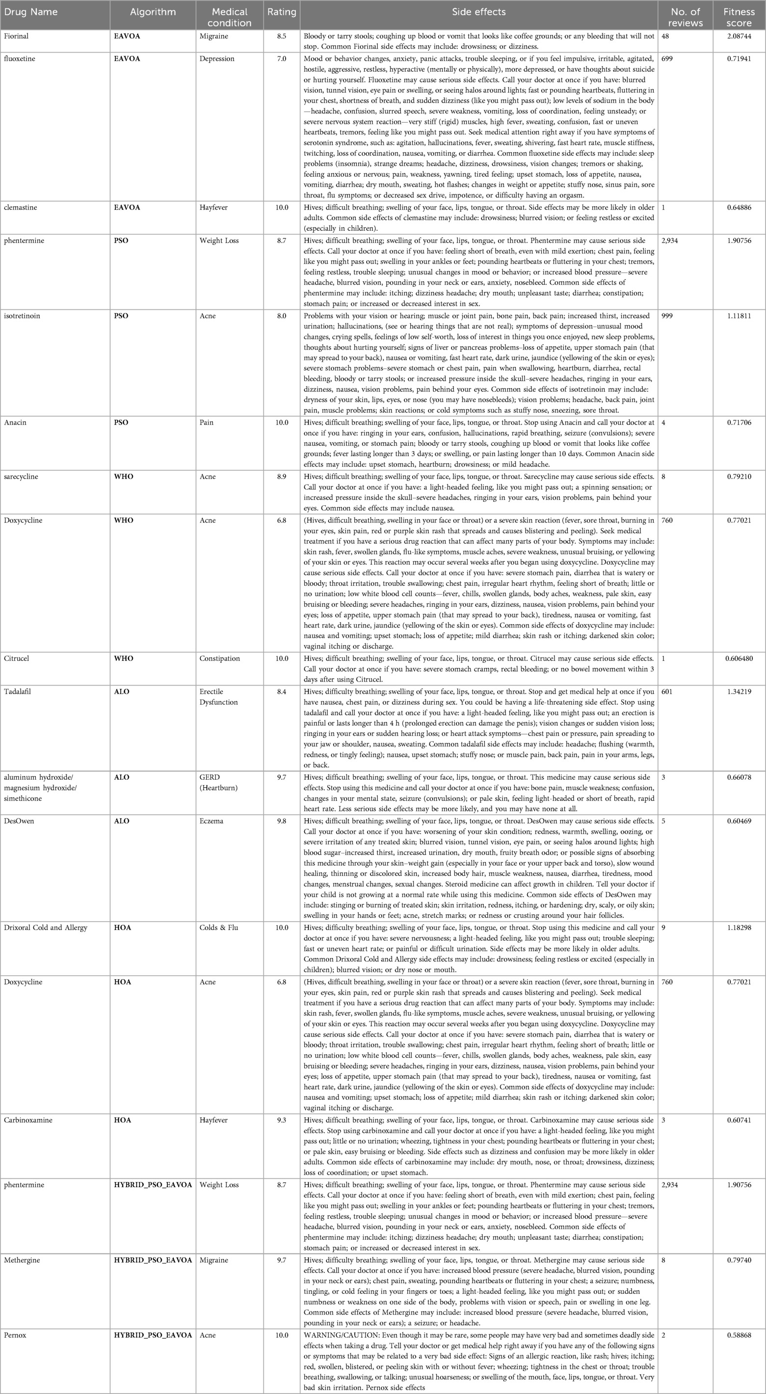 Discussion: The specific method of weighted-sum aggregation was used in this study, the framework offered could be easily compatible with other forms of aggregation. Hybrid PSO-EAVOA demonstrates strong potential for broader application in fields such as pharmacovigilance, clinical decision support, and drug re-purposing. The dataset is publicly available on Kaggle Drugs Side Effects and Medical Condition and all source code for parameter settings and preprocessing scripts is publicly available at the GitHub repository https://github.com/suruthi-m/Hybrid_PSO_EAVOA.