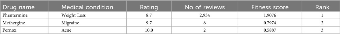 3. Pernax (acne)—Patient Rating: 10.0; Fitness Score: 0.5887. The valid evaluation demonstrated the excellent therapeutic value and relative adherence from patients.