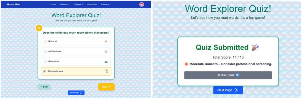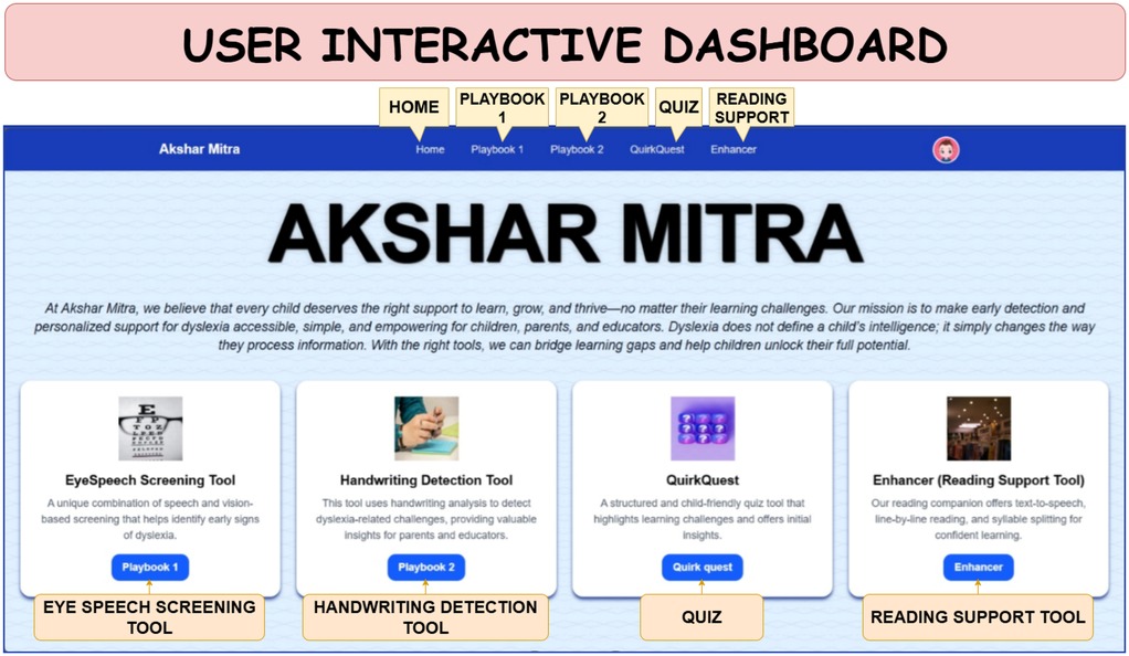 Beyond detection, Akshar Mitra offers a dyslexia-friendly Reading Companion that incorporates evidence-based practices, large fonts, extra spacing, syllable-level breakdowns, and synchronized audio playback, to reduce cognitive load and enhance reading engagement. This study seeks to make early screening and intervention more accessible by designing a scalable, affordable, and child-focused solution, with special attention to reaching communities that face barriers due to limited resources or social marginalization. The User Interactive Dashboard of Akshar Mitra is illustrated in Figure 1, providing a high-level view of its components and workflow.