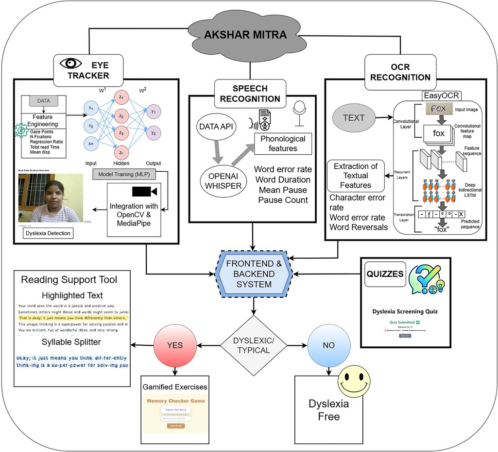 The application of eye tracking technology to examine the visual attention and behavior of children offers a timely, objective, and non-invasive way to study developmental disorders such as dyslexia. This technology precisely monitors the eyeballs by capturing and monitoring the eye movements through sophisticated cameras. Key eye tracking metrics include fixation counts, processing speed, saccades, scan path, dwell time and gaze duration (15). These measures provide important insights that can effectively differentiate between typical and dyslexic reading behaviors. Coupling machine learning with eye tracking data, they’ve demonstrated increased classification accuracy and promising possibility for scalable, early dyslexia screening in classrooms. Eye-tracking has also deepened our insight into the psychology of dyslexia by accurately recording eye fixations. Other ML models, including SVMs and CNNs, have also been deployed with great success on eye movement data to predict dyslexics (16, 17). Akshar-Mitra, a proposed solution, incorporates eye-tracking as a fundamental detection feature, likely utilizing it to monitor a child’s eye movements during reading tasks to identify patterns indicative of dyslexia (9).