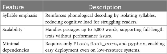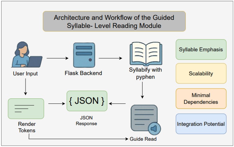 (a) Reading Support System: To assist children after screening, a lightweight Reading Support System was developed that emphasizes syllable-level decoding and pacing adjustments. The system is implemented as a Flask-based web service that interfaces with a React or static front-end, enabling seamless integration into classroom or home environments.
