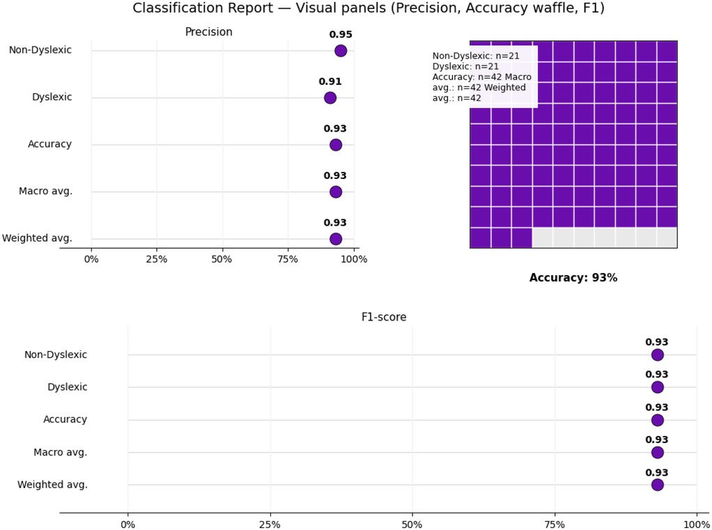 The classification of the standardized features is performed by a Multilayer Perceptron (MLP) . The network architecture comprises a single hidden layer with 64 neurons utilizing a Rectified Linear Unit (ReLU) activation function. The model was optimized using the Adam algorithm with a cross-entropy loss function. For training and evaluation, the dataset was partitioned via stratified sampling into an 80% training set and a 20% held-out validation set to maintain class balance. On the validation data, the classifier achieved an accuracy of approximately 92% and a high F1-score in distinguishing between dyslexic and typical readers. For deployment, the trained model weights and the feature standardization scaler are stored. The inference pipeline first transforms a new feature vector using the saved scaler and then inputs it into the MLP to generate a final dyslexia probability score.