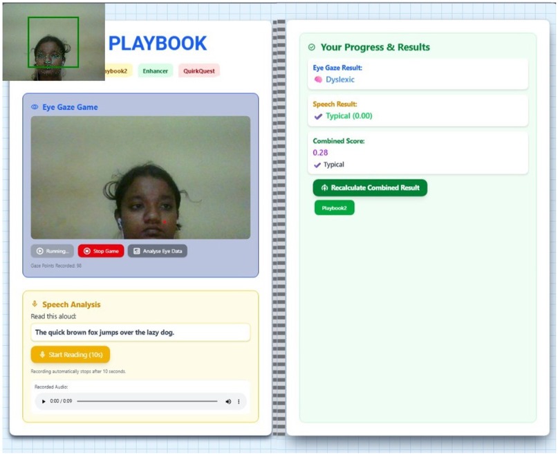 This work describes a new multimodal system developed as a tool for dyslexia screening, which integrates two diagnostic modules-Eye-Gaze Analysis and Speech Analysis-under a unified digital framework Figure 7, 8. The user protocol is comprised of two sequential tasks: an eye-tracking session, lasting 10 s, that gathers and validates the required number of eye-landmark samples, followed by a speech task lasting 10 s in which the user reads a prescribed sentence. The two modalities are processed separate then the aggregated eye-gaze features are entered into a trained classifier that outputs an initial estimate, whilst the recorded audio is processed as input to estimate the Word Error Rate (WER) and provide an Automatic Speech Recognition (ASR) transcript. Here, the innovation in the system is the sophisticated combination of these outputs into a “Combined Score” that is rendered along with the individual outputs. By comparing quantitative indicators (gaze patterns, WER) with qualitative data (playback of the recorded audio, transcripts), this unified system provides a comprehensive, multifaceted interpretation of reading proficiency, thereby providing a more reliable and subtle screening output that could be achieved through unimodal analysis alone.