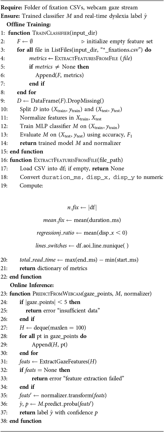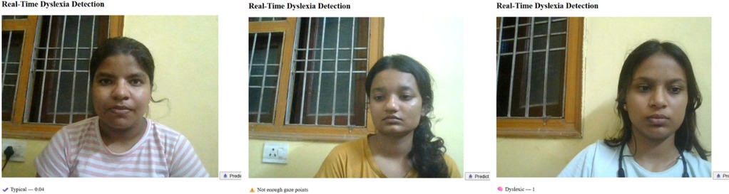 These features are normalized and passed as input to a pretrained neural classification model, which outputs a probability score indicating the likelihood of dyslexia. The real-time inference result is dynamically overlaid onto the video feed, displaying indicative labels such as “Typical” or “Dyslexic” along with their corresponding confidence values. All feature vectors, predictions, and timestamps are securely logged for subsequent offline analysis. The end-to-end gaze tracking pipeline is optimized for low-latency operation, ensuring interactive performance during live sessions.