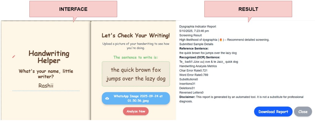 The system utilizes the xhtml2pdf library to convert a Jinja2-based HTML template into a downloadable PDF diagnostic report. This report includes the uploaded handwritten image, the OCR result alongside the expected sentence, and a visual comparison highlighting symbol matches and mismatches. It also contains all extracted metrics, such as character error rate (CER), word error rate (WER), and reversal count, along with the final risk classification message. These reports can be archived or shared with clinicians or educators for deeper follow-up. Additionally, this functionality facilitates anonymized data collection to support future supervised learning tasks.