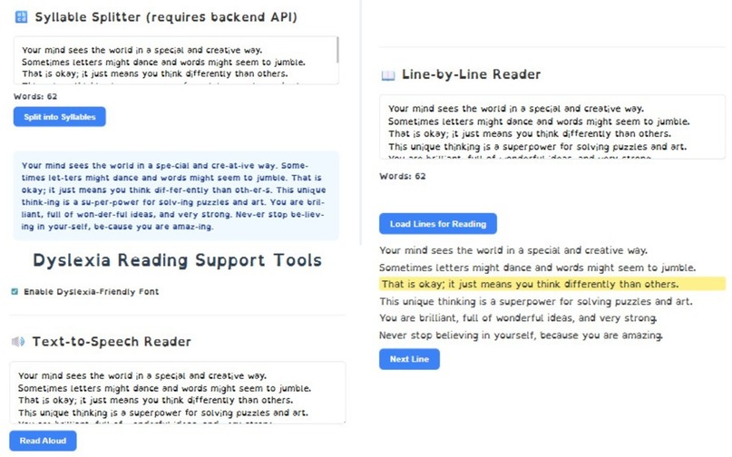 A novel software application tailored for dyslexic readers synergistically combines three evidence-based support strategies. First, an integrated Text-to-Speech (TTS) engine vocalizes each word, reinforcing grapheme–phoneme correspondence and aiding auditory processing. Second, a line-by-line reading mode dynamically highlights one text line at a time, minimizing visual tracking errors and enhancing reading flow. Third, an auto-syllabification module segments longer words into pronounceable syllable units, reducing decoding effort and cognitive load Figure 11. By simultaneously targeting auditory, visual, and decoding deficits, the system provides a comprehensive assistive tool that empowers dyslexic individuals to improve reading accuracy and confidence.