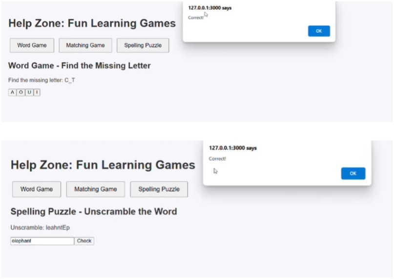 The platform includes interactive games that promote letter–sound recognition and word formation skills. In the “Missing Letter” activity, children learn to identify letters within words using contextual image clues, enhancing phonemic awareness. The “Word Unscramble” game reinforces spelling and vocabulary by requiring users to reconstruct jumbled words Figure 12. These modules are both educational and diagnostic, capturing subtle learning patterns that support dyslexia assessment.