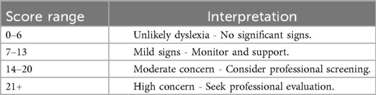 The total score is then mapped to one of three discrete risk classes. A score greater than or equal to 7 (23) indicates high risk, suggesting that immediate and detailed screening is recommended. Scores between 4 and 6 correspond to a moderate risk category, where monitoring for patterns and retesting is advised. A score below 4 reflects a low risk assessment, implying that no significant dyslexia indicators were found.
