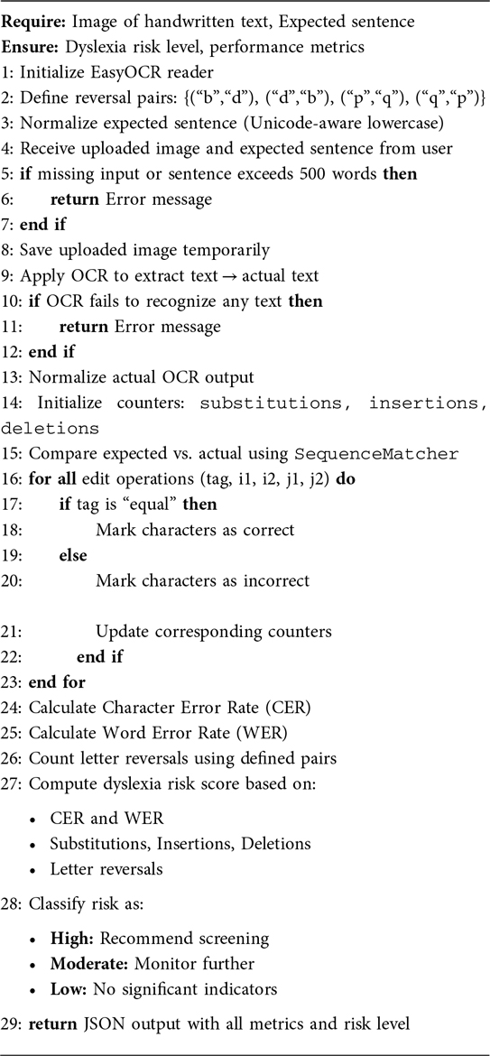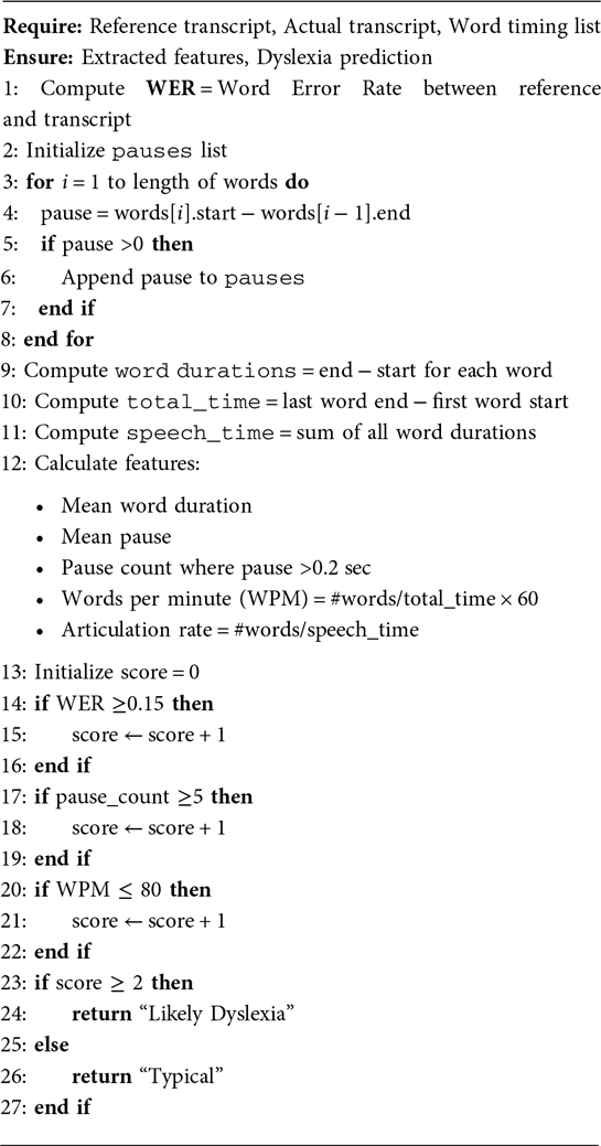 The current prototype for speech-based dyslexia screening utilizes an Automatic Speech Recognition (ASR) engine (OpenAI’s Whisper) to process recordings of a child reading a fixed text. From the resulting transcription, quantitative features such as Word Error Rate (WER), pause statistics, and speaking rate in Words Per Minute (WPM) are computed against the known ground-truth passage. Dyslexia risk is subsequently assessed using a preliminary, heuristic-based algorithm. While this approach has provided initial validation, its performance is fundamentally constrained by a dependency on these heuristics and the absence of a large, curated dataset for training a robust classification model.The stepwise implementation of this process is formalized in the following Algorithm 2