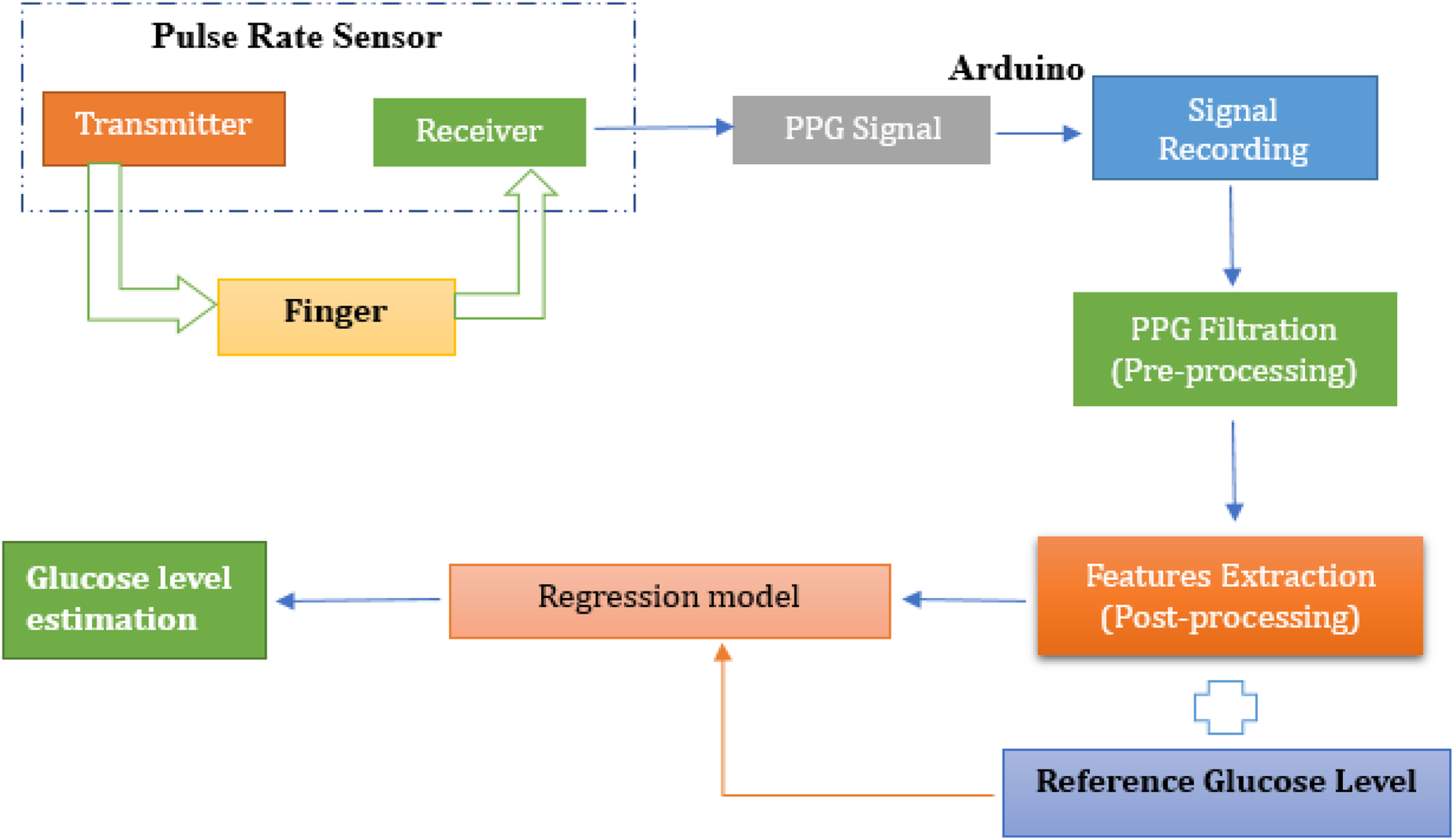 The methodology involved numerous interconnected steps, ranging from signal acquisition to the development and evaluation of regression models, with the goal of developing a non-invasive glucose monitoring tool based on PPG signals. A visual representation of proposed working mechanism is illustrated in Figure 1.