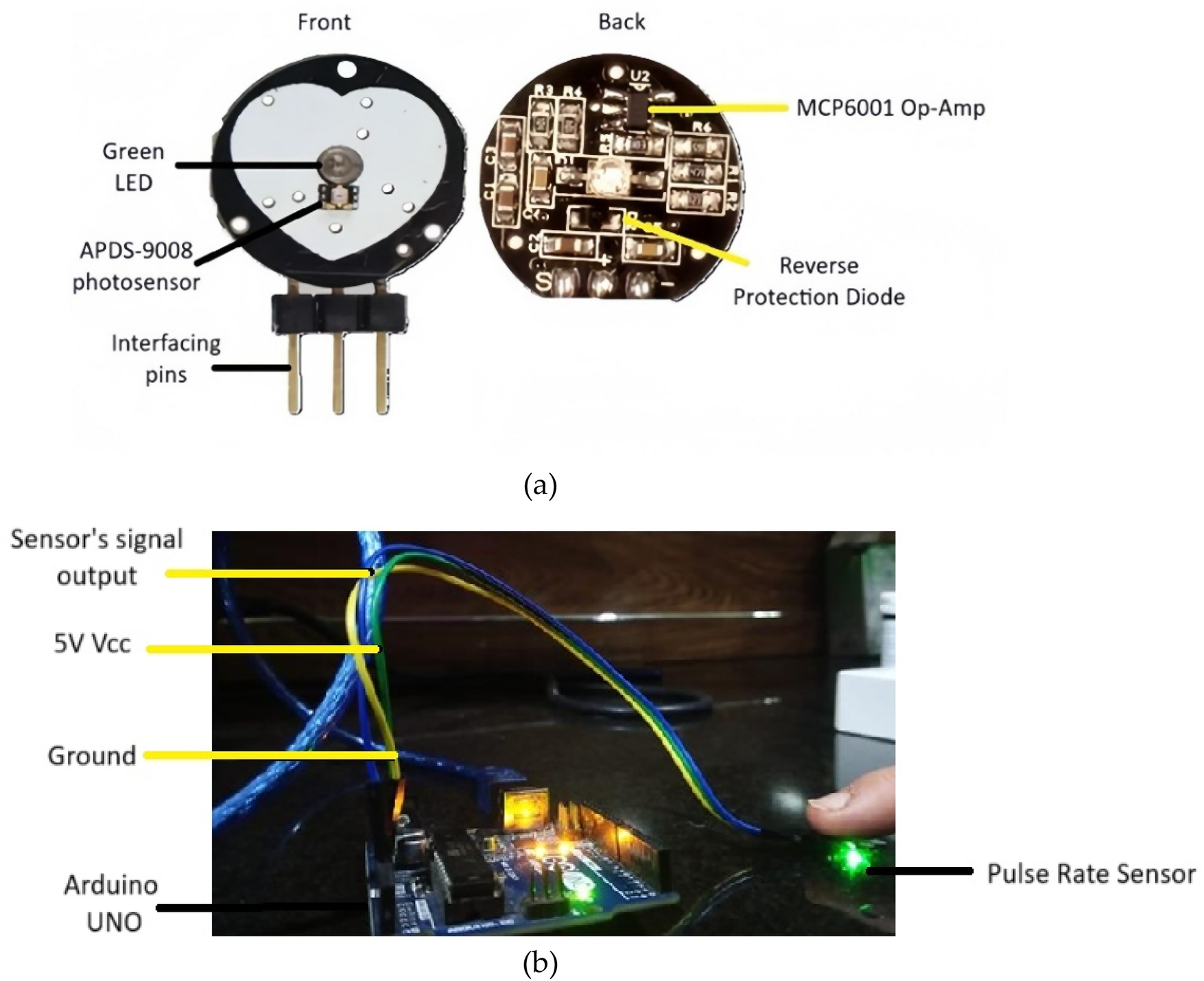 (a) Key components of pulse rate sensor (b) PPG acquisition setup involving pulse rate sensor interfaced with arduino Uno.