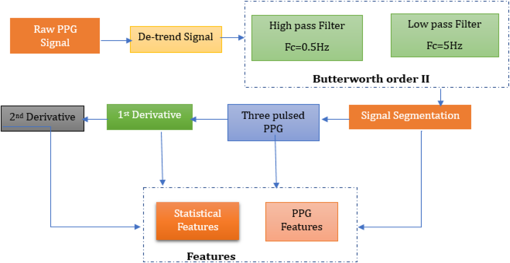 The acquired PPG signals are noisy due to motion artifacts, power line noise and other factors involved. These signals need to be processed before feature extraction. Signal processing is conducted in MATLAB (R2023a, The MathWorks, USA), using the Signal Processing Toolbox. Signal preprocessing and feature extraction employed standard functions such as detrend, butter, filtfilt, findpeaks, and diff for derivative-based waveform analysis. It also allows quick implementation of various signal processing algorithms. Flow diagram for PPG signal processing is illustrated in Figure 5, which involves all the steps to be performed for pre-processing and post- processing of PPG signals.