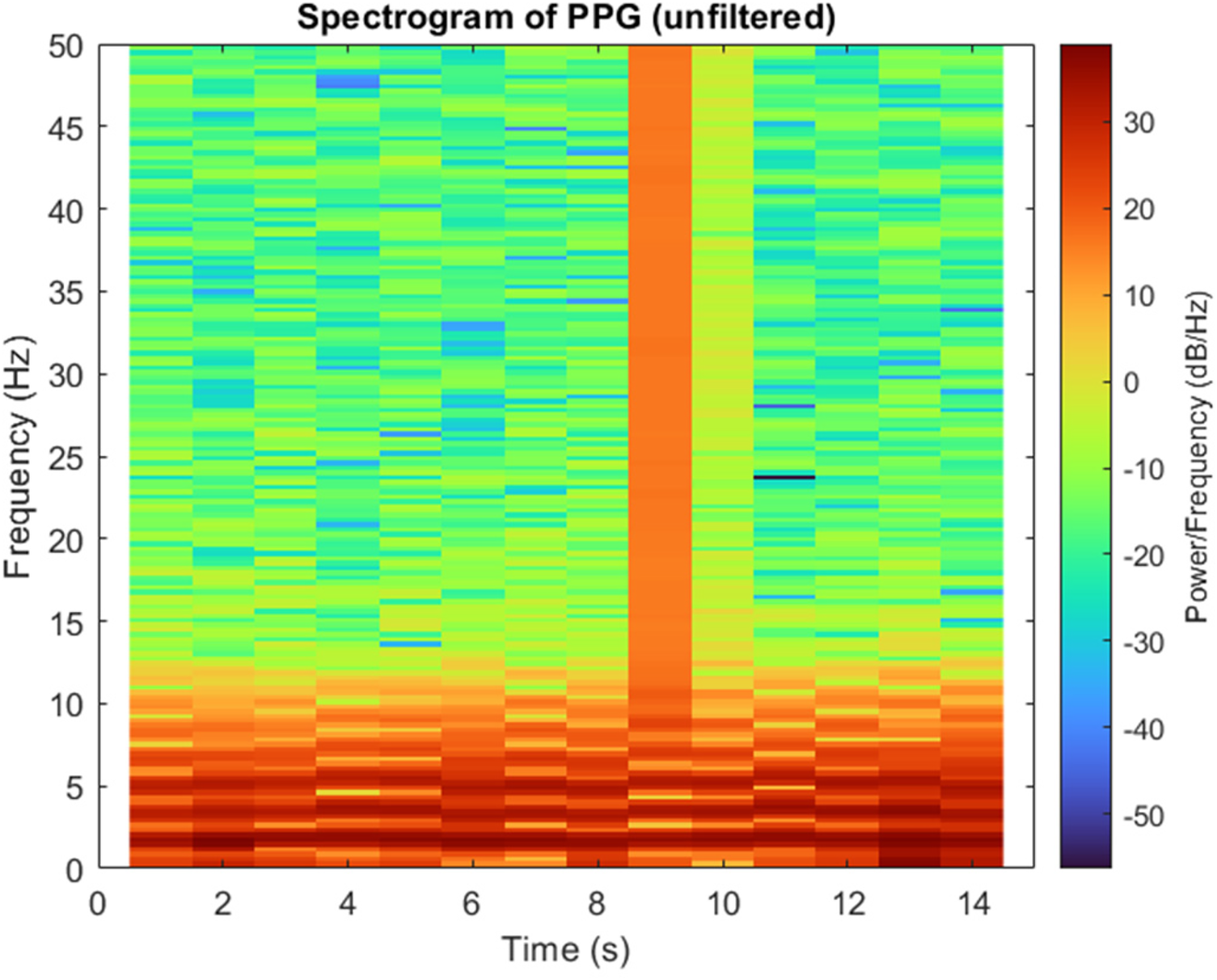 Spectrogram of a PPG signal showing the distribution of power across frequency and time.