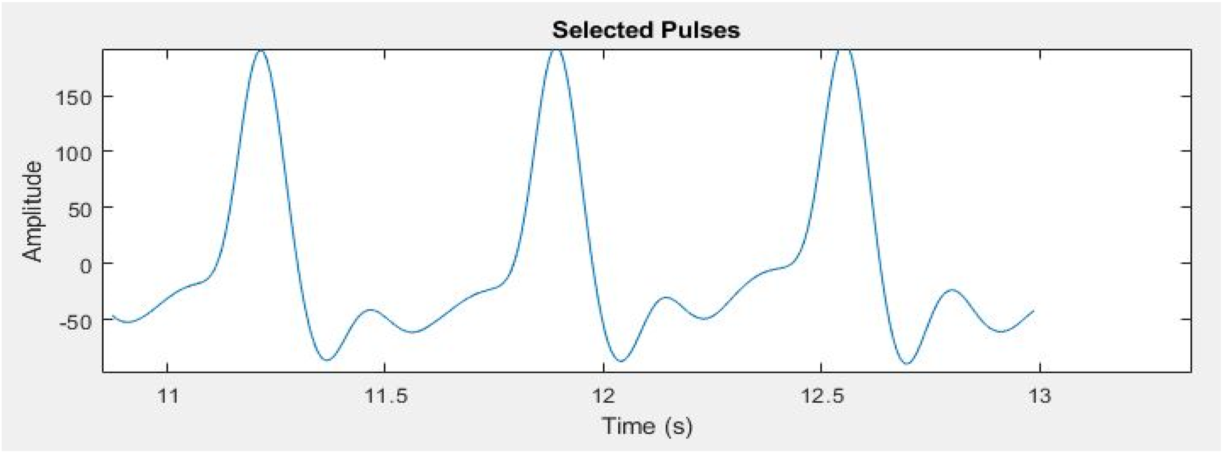 Signal segmentation is essential in the analysis of PPG signals for the identification and selection of specific pulses of interest. To segment the PPG signal based on its periodicity, an enhanced moving window approach is employed to identify the peak and valley values within the signal (45). The window size was determined using the physiological heart rate range of 60–100 beats per minute, corresponding to one cardiac cycle occurring approximately every 0.6–1.0 s. This range reflects the normal resting HR of healthy adults as reported in clinical literature and supported by the American Heart Association (46). Selecting the window based on this range ensured that each segment encompassed one complete cardiac cycle, allowing accurate identification of systolic peaks and diastolic valleys without signal overlap or false detections. MATLAB was later used to implement the enhanced moving window algorithm. This algorithm continuously adjusts the window along the signal's time axis, detecting peaks and valleys in each timeframe (47). Peaks and valleys correspond to the systolic and diastolic phases of the heart cycle. Based on the observed valley points, the signal was split into regular intervals. These valley spots show the end of one pulse and the start of the next. The signal was segmented in a way that each segment represented a complete PPG pulse. Three consecutive pulses were segmented from the signal, as shown in Figure 8 for detailed analysis, in order to reduce the data size while performing signal processing algorithms.