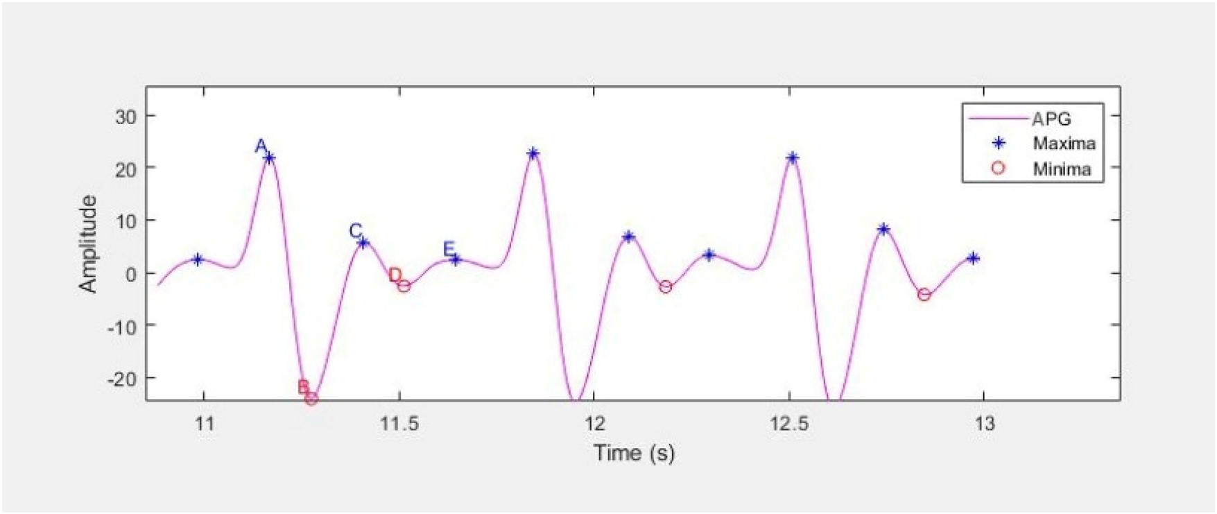 APG waveform comprises of four systolic waves (a, b, c and d wave) and one diastolic wave (e wave) as shown in Figure 10. The five a, b, c, d, e parameters as well as their ratios, have been shown to express significant information about cardiovascular condition of the person (48). a wave represents early systolic positive wave, b-wave shows early systolic negative wave, c-wave represents late systolic re-increasing wave, d-wave represents late systolic re-decreasing wave and e-wave is the early diastolic positive wave and represents the dicrotic notch.