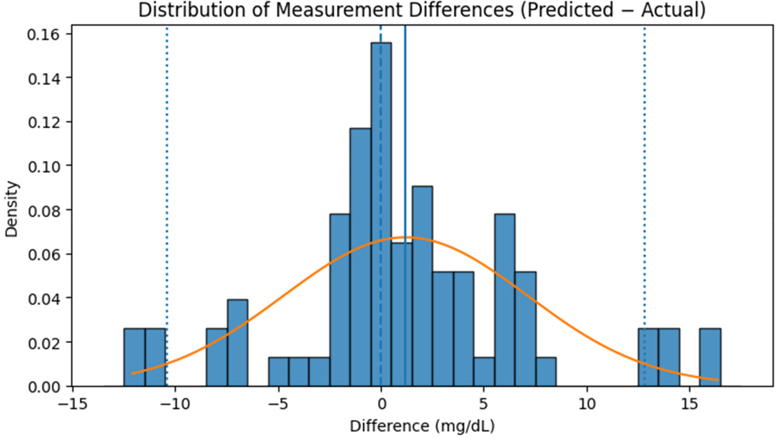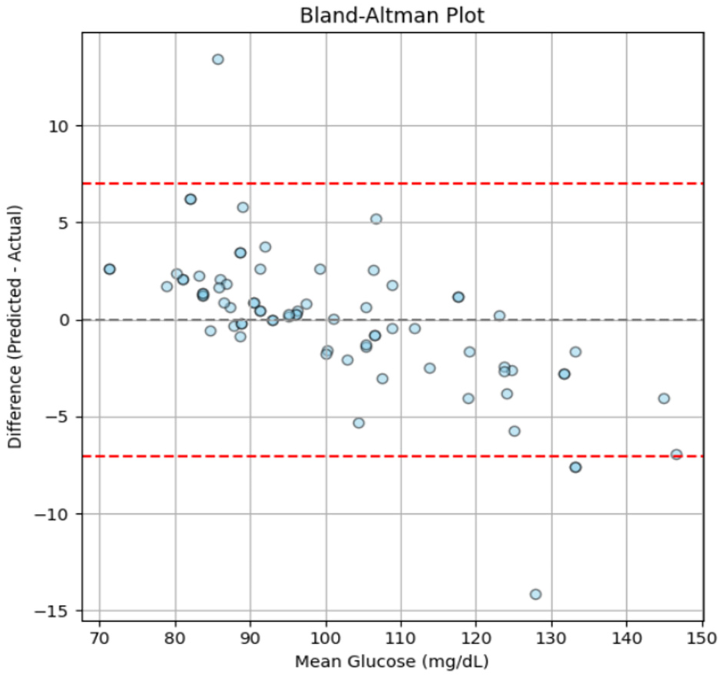 Table 3 presents the demographic characteristics of the study participants. After removing outlier glucose readings, this heterogeneous group offered a solid dataset for evaluating PPG signals during fasting and post-prandial conditions. Blood pressure was measured during participant recruitment to monitor general physiological status; however, it was not included in the present analysis, as the focus of this study was limited to PPG-derived features for glucose estimation. Among participants, 10 subjects had pre-existing conditions, such as diabetes with controlled sugar levels or pre-diabetes. All participants involved had glucose levels between 65 and 160 mg/dL, which allowed for variability within a clinically important and safe range as established under study criteria.