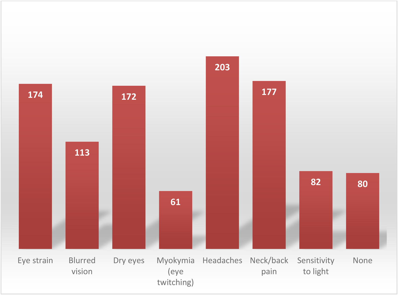 Figure 1 illustrates the distribution of individual eye-related symptoms reported by participants. Overall, headache, neck/back pain, eye strain, and dry eyes were the most frequently reported symptoms, whereas myokymia and light sensitivity were less commonly reported.