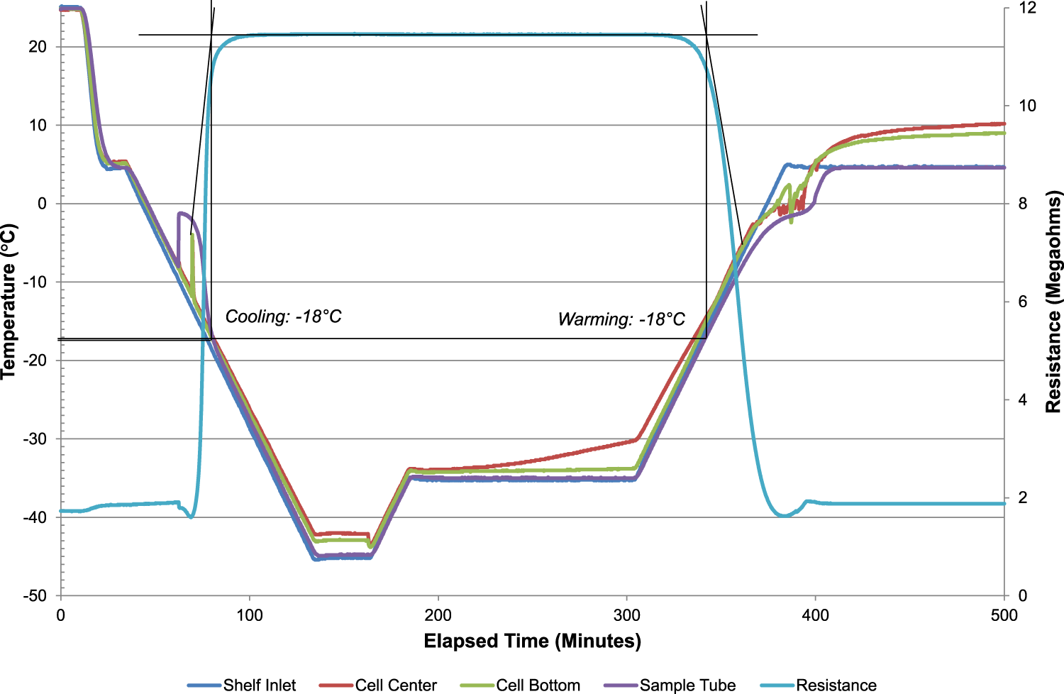 ER was measured on approximately 1.8 ml of sample in a 20-mm glass tube using a 0–20 MΩ resistance instrument and a ceramic resistance probe consisting of two parallel gold strips on a ceramic plate. Temperature was measured using a 32-gauge type-T thermocouple located at the ceramic probe on the opposite side of the gold plates. The sample was cooled and warmed at an average rate of 0.5°C/min at atmospheric conditions, with the warming ramp paused for 2 h at −35°C to mimic the FDM conditions (below). A deviation in resistance was used to determine the onset of the phase transition upon cooling or warming. A Kaye Validator instrument with associated Collect software (St. Marys, PA) recorded temperature measurements every 10 s.