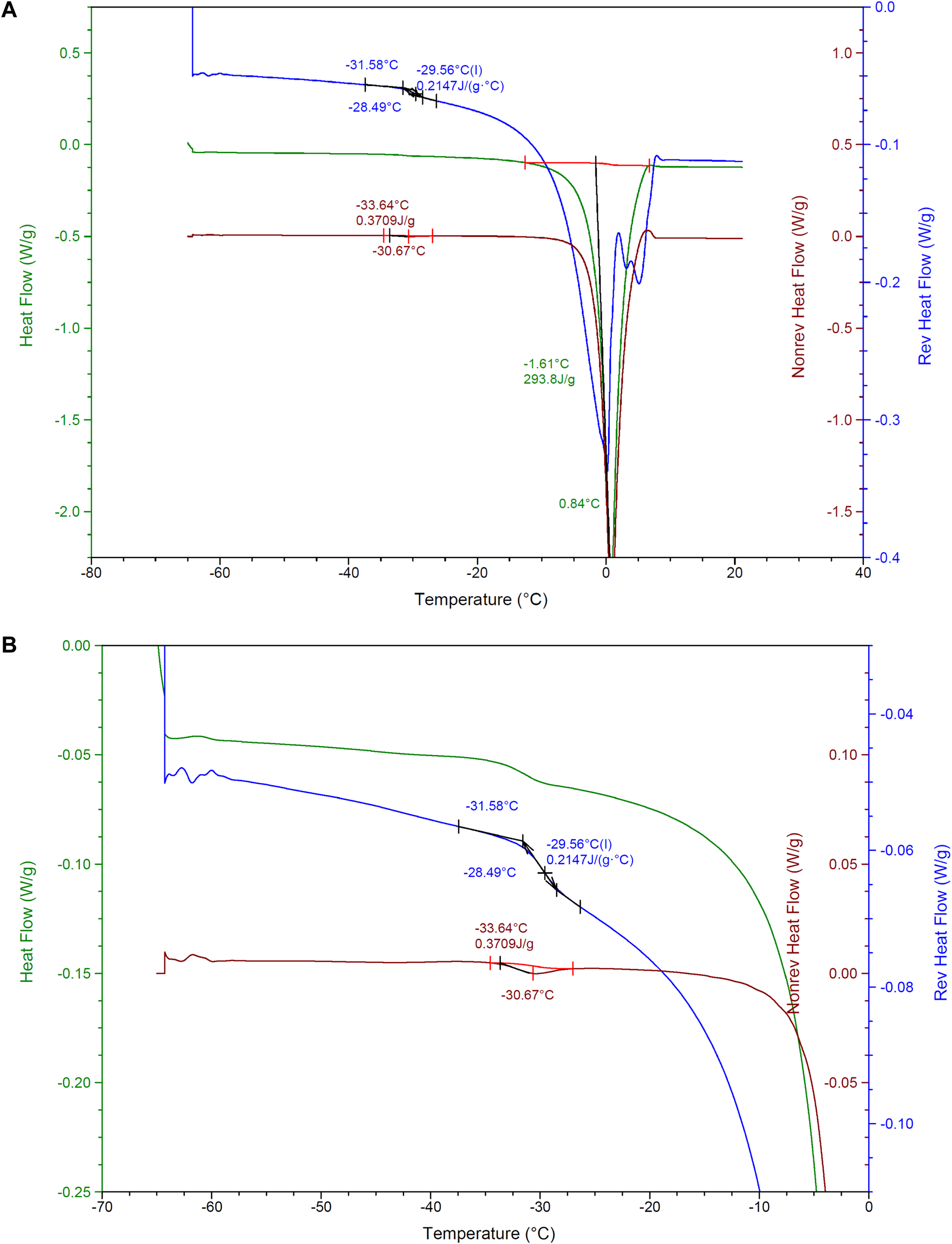 Differential scanning calorimetry thermal analysis of bulk liquid ID93 + GLA-SE vaccine formulation prior to lyophilization. (A) Modulating LT-DSC was conducted on samples frozen to −65°C and warmed at 2°C/min with a sinusoidal modulation of ±0.32°C every 60 s, allowing identification of the reversing heat flow (heat capacity component) and the non-reversing heat flow (kinetic component). The glass transition is detected in the reversing heat flow component, whereas the melting transition can be represented in both components. Line colors correspond to the y-axes. (B) Magnified section of panel (A) to highlight the glass transition behavior.