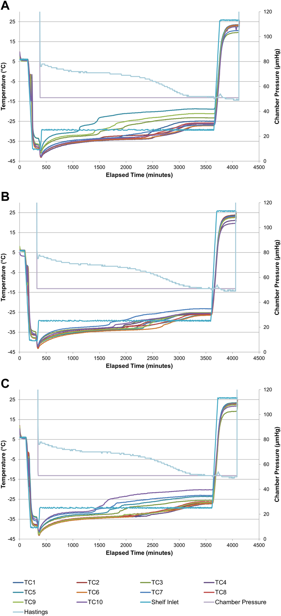 Thermocouples placed in the bottom of up to ten product vials located near the center or the edge of the tray were used to monitor product temperature at various locations. Shelf temperature and chamber pressure were also monitored throughout the lyophilization process. In addition, a thermocouple vacuum gauge (Teledyne Hastings, Hampton, VA) and a residual gas quadrupole mass spectrophotometer (Microvision Plus, MKS Instruments, Andover, MA) were employed to monitor the gas environment within the lyophilization chamber in selected batches.