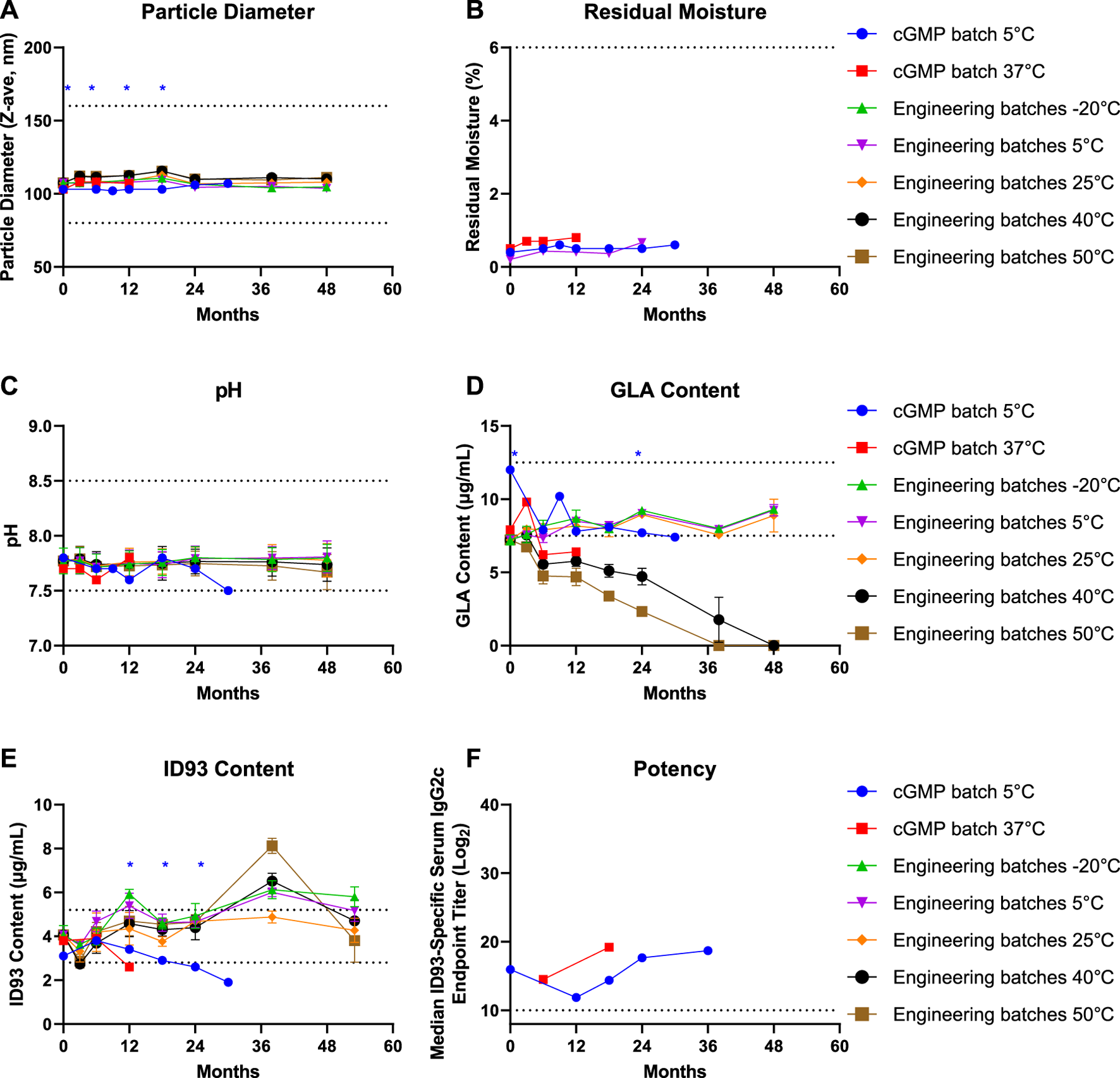 Statistical analysis of stability data was performed using GraphPad Prism v9.4.1 (San Diego, CA). Unpaired parametric t tests comparing the cGMP batch to the engineering batches at shared temperatures and time points were performed assuming Gaussian data distribution and a single pooled variance (i.e., that all samples were from populations with the same standard deviation). However, due to the limited number of samples, it was not possible to verify these assumptions. The t tests were corrected for multiple comparisons using Holm-Sidak’s method, and the statistical significance threshold α was set as p < 0.05.