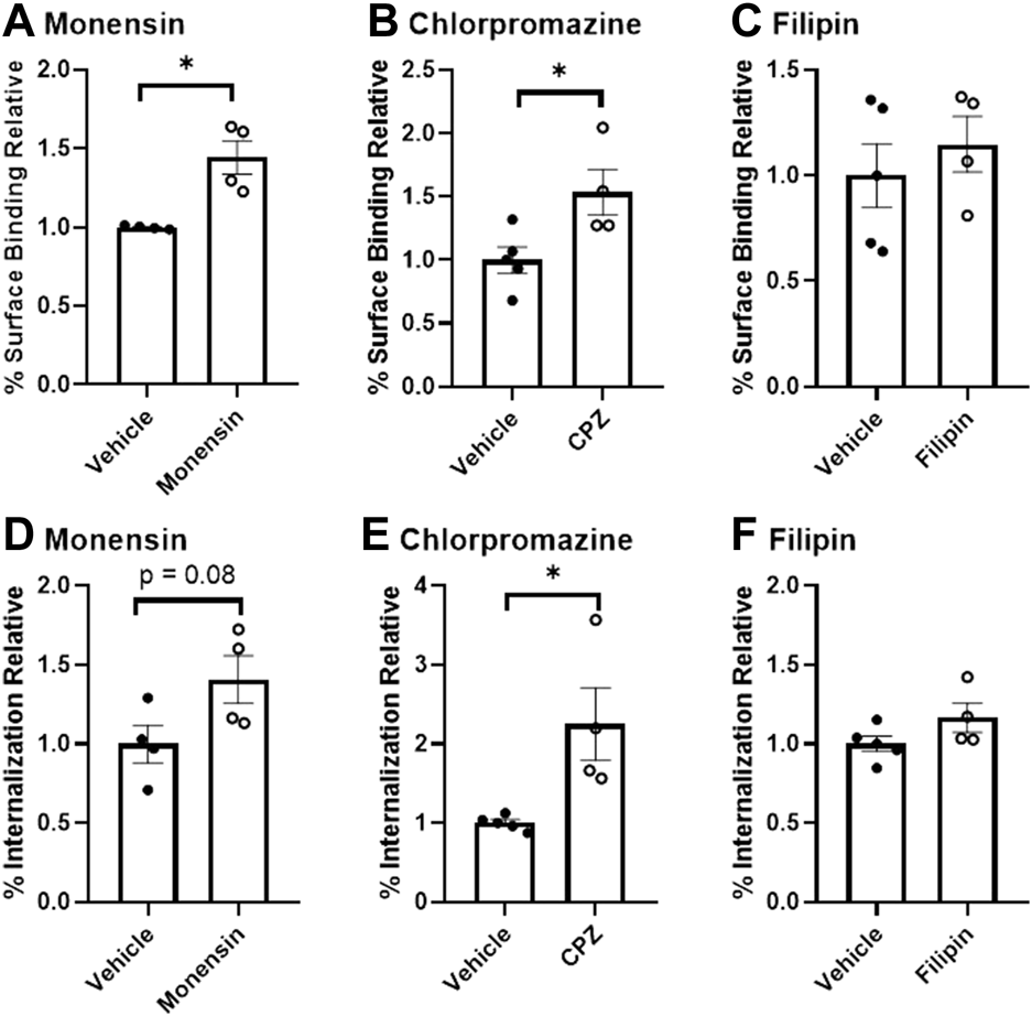 Binding and endocytosis of insulin in isolated mouse brain microvessels. Surface Binding (A–C) and Internalization (D–F) of 125I-insulin was investigated. 125I-insulin surface binding was significantly increased in the presence of monensin and chlorpromazine (*p < 0.05), but not filipin. The amount of 125I-insulin internalized was significantly increased with E) chlorpromazine (*p < 0.05).
