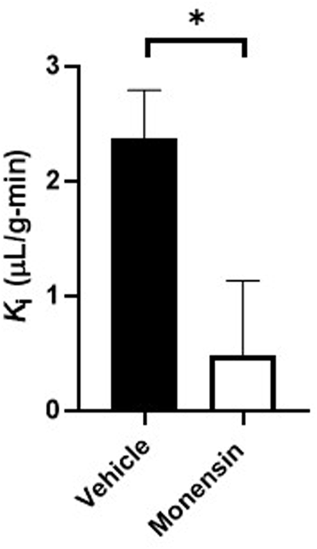 To validate the use of the clathrin inhibitor in vivo, we first investigated transferrin BBB transport, a substrate shown by ultrastructural electron microscopy to involve clathrin (Roberts et al., 1993). Mice pre-treated with monensin resulted in a significant 80% decrease in the hypothalamic BBB transport of 125I-transferrin (Veh Ki = 2.37 ± 0.43 vs. Monensin Ki = 0.48 ± 0.66 µL/g-min, p = 0.033, Figure 3) in vivo following correction of the vascular space. These data provide additional evidence of the effect of monensin to block clathrin-mediated BBB transendothelial transport in vivo and acts as a positive control for our insulin transport investigations.