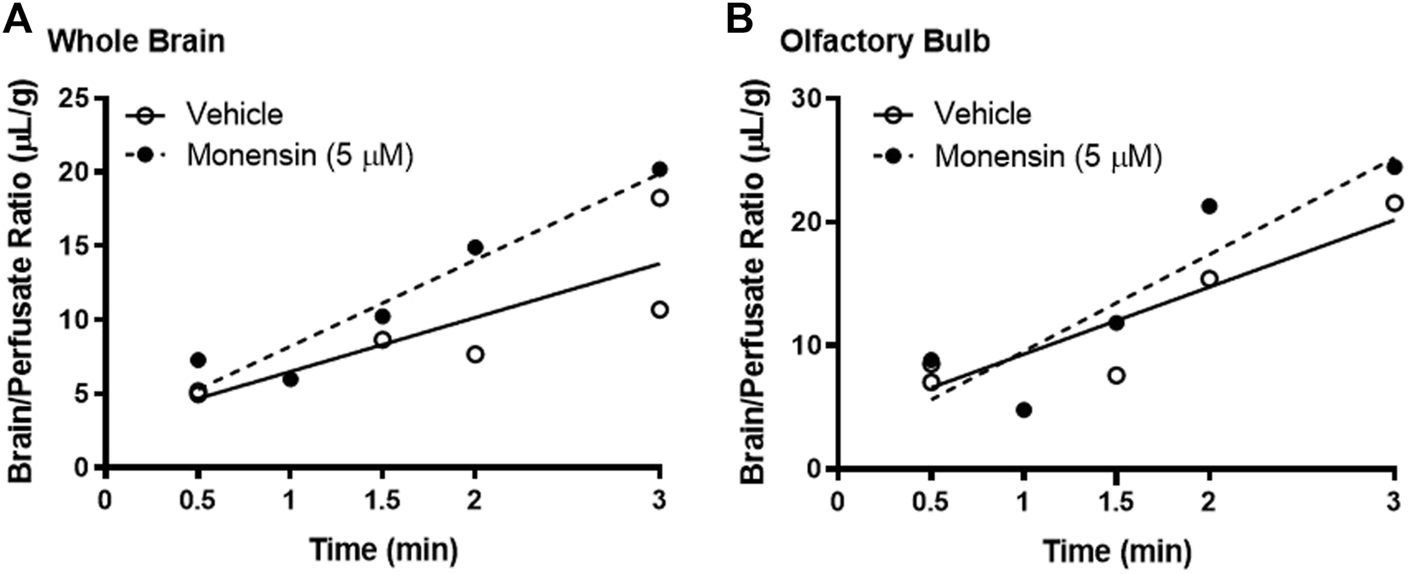 Role of clathrin in insulin BBB transport. Pre-treatment (10 min) with 5 µM monensin has no effect on 125I-insulin transport (Ki) or vascular binding (Vi) in (A) whole brain or (B) olfactory bulb. Table 1 lists the Ki and Vi for each linear regression.