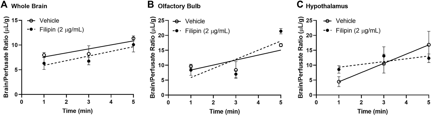 Role of caveolin in insulin BBB transport. Pre-perfusion for 10 min with 2 μg/ml filipin has no effect on 125I-insulin transport (Ki) or vascular binding (Vi) in (A) whole brain or (B) olfactory bulb but does limit transport (Ki) in the (C) hypothalamus. Table 2 lists the Ki and Vi for each linear regression.