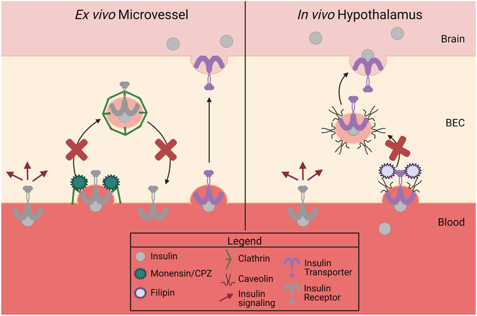 Summary of data. There are two separate proteins responsible for insulin binding (receptor) and insulin transport (transporter) at the BBB. Insulin binding on isolated mouse microvessels is clathrin-dependent (left side), while in vivo insulin transport is regionally regulated but dependent on caveolin in the hypothalamus (right side). This figure was created with Biorender.com.