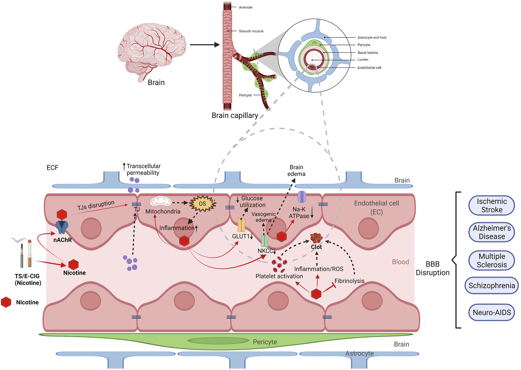 FIGURE 1. Effect of nicotine from tobacco smoke (TS) and electronic cigarette (e-cig) on blood-brain barrier (BBB) disruption. BBB is mainly composed of endothelial cells (red), astrocytes (blue), pericytes (green) and basal lamina. Nicotine enters the brain through nicotinic acetyl choline receptors (nAChRs) and disrupts the function of BBB by several mechanism. Nicotine can downregulate tight junction proteins (TJs) like ZO-1, claudins and occludins which results in increased transcellular permeability. Nicotine also disrupts mitochondrial function leading to increased oxidative stress (OS) and elevated inflammation and cytokines. Nicotine downregulates several transporters and receptors such as GLUT-1, NKCC and NA-K ATPase resulting in decreased brain glucose utilization and increased brain edema respectively. Moreover, nicotine causes platelet activation, increases inflammation, and inhibits fibrinolysis which ultimately results in clot or thrombus formation. This clot increases the chance of ischemic stroke. Thus, nicotine disrupts the BBB and plays a major role in pathogenesis of several cerebrovascular dysfunction including ischemic stroke, Alzheimer’s disease, multiple sclerosis, schizophrenia and neuro-AIDS.