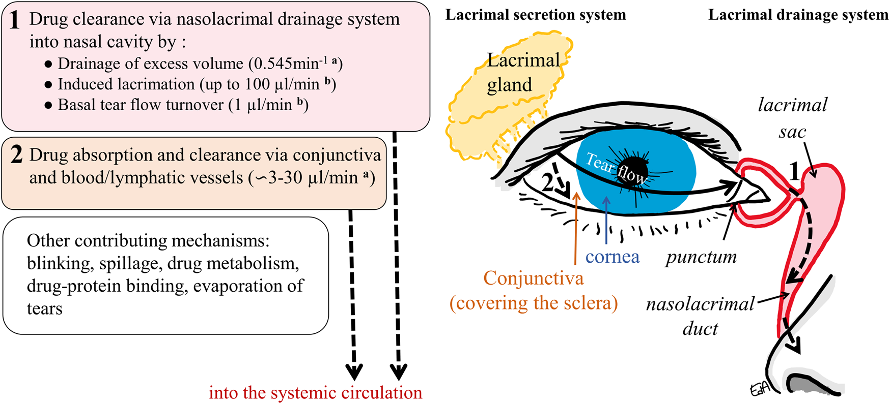 A schematic representation of the anterior part of the eye is shown in Figure 1, including the lacrimal secretion and drainage systems and the drug clearance paths from the ocular surface.