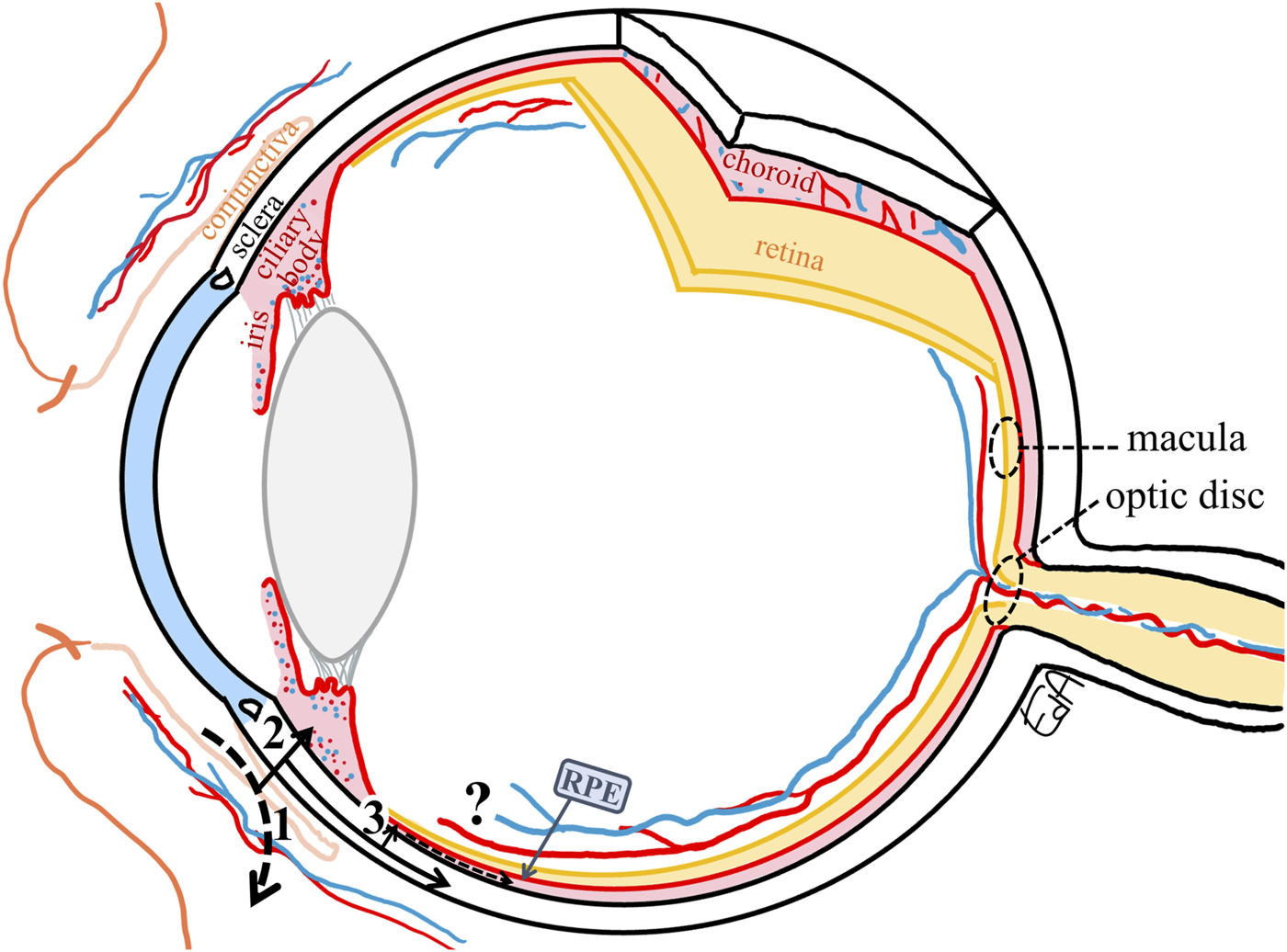 After crossing the anterior sclera, the drug then diffuses into the uveal tract, the vascularized and melanin-containing layer, that comprises the iris, ciliary body (anterior uvea), and choroid (posterior uvea), with the latter providing nutrition to the outer retina. These routes of drug diffusion are depicted in Figure 4. The most probable path for the topical drugs to enter the posterior tissues is via the non-corneal route as described previously by Ahmed and Patton, (1985); Ahmed and Patton, (1987), that is, the drug permeates across the anterior sclera through the suprachoroidal space and reaches the choroidal tissue. The choroid is a vascular and connective tissue layer that consists primarily of large and highly fenestrated blood vessels, with the highest blood flow per unit weight compared to any other tissue in the body (Alm and Bill, 1973), being 62 ml/h in rabbits (Nilsson and Alm, 2012) and 43 ml/h in humans (Sebag et al., 1994). Therefore, most of the drug that enters the choroid will be cleared by the choroidal blood flow, and only a small fraction may cross the outer BRB, that is, passing through the retinal pigment epithelium (RPE) to penetrate the peripheral inner retina.