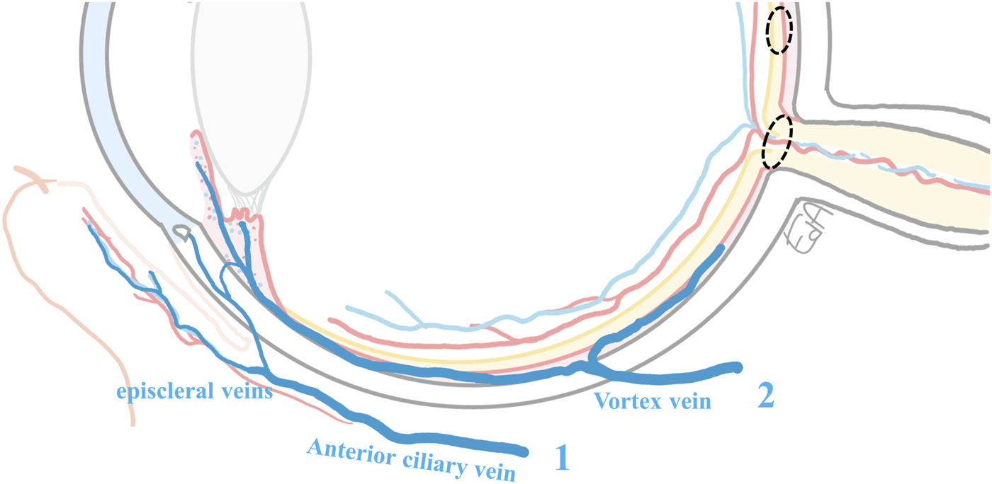 Schematic representation of the ocular venous drainage: 1) from conjunctiva and Schlemm’s canal vasculature draining to the episcleral veins and the anterior ciliary vein, and 2) from the iris, ciliary body vessels, and the choriocapillaris, blood drains into the vortex vein before exiting equatorially from the eye. The ciliary body blood also partly drains into the episcleral veins. The anterior ciliary veins and the vortex vein, posteriorly within the sclera, reach the inferior and the superior ophthalmic veins of the orbit (Chiou et al., 1989; Anand-Apte and Hollyfield, 2010). The target tissues for the treatments of macular edema and glaucoma are marked with dashed circles.