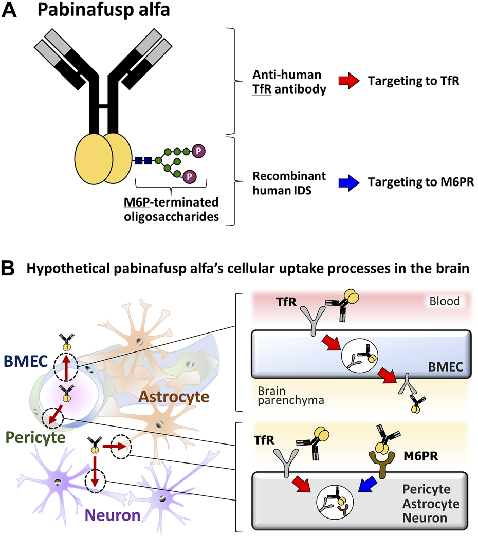 Diagrams of the pabinafusp alfa structure and its hypothetical cellular uptake routes. (A) The structure of pabinafusp alfa. Pabinafusp alfa consists of the anti-human TfR antibody moiety and the recombinant human IDS moiety (a main body exerting its therapeutic effects), which are genetically fused. The former part can bind to TfR, while the latter part, which carries a polysaccharide chain containing M6P, can recognize M6PR. (B) The hypothetical uptake routes of pabinafusp alfa in various types of the brain cells. Utilizing the anti-human TfR antibody moiety, pabinafusp alfa is supposed to pass through BMECs via TfR-mediated transcytosis. Then, pabinafusp alfa is assumed to be incorporated into various types of brain cells through M6PR-mediated endocytosis, as with the case of IDS. In these processes, its anti-human TfR antibody moiety may play additional roles by triggering TfR-mediated endocytosis.