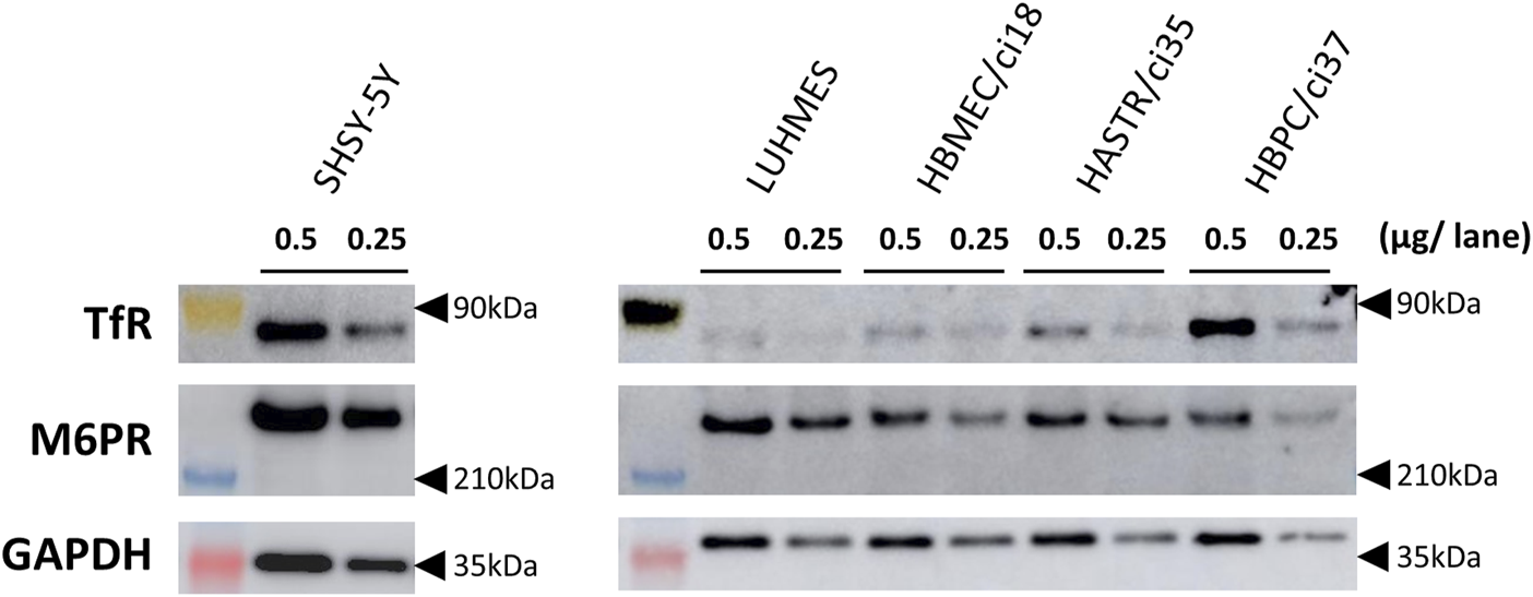 The protein expression of TfR and M6PR in different human brain-derived cell types. The protein expression of TfR and M6PR were examined by Western blotting analyses using whole cell lysates (0.25 or 0.5 μg/lane) prepared from differentiated SH-SY5Y, differentiated LUHMES, HBMEC/ci18, HASTR/ci35, and HBPC/ci37 cells. GAPDH was used as a loading control. The representative results obtained from two independent experiments (N = 2) are shown (uncropped images of Western blotting analyses are shown in Supplementary Figure S2).