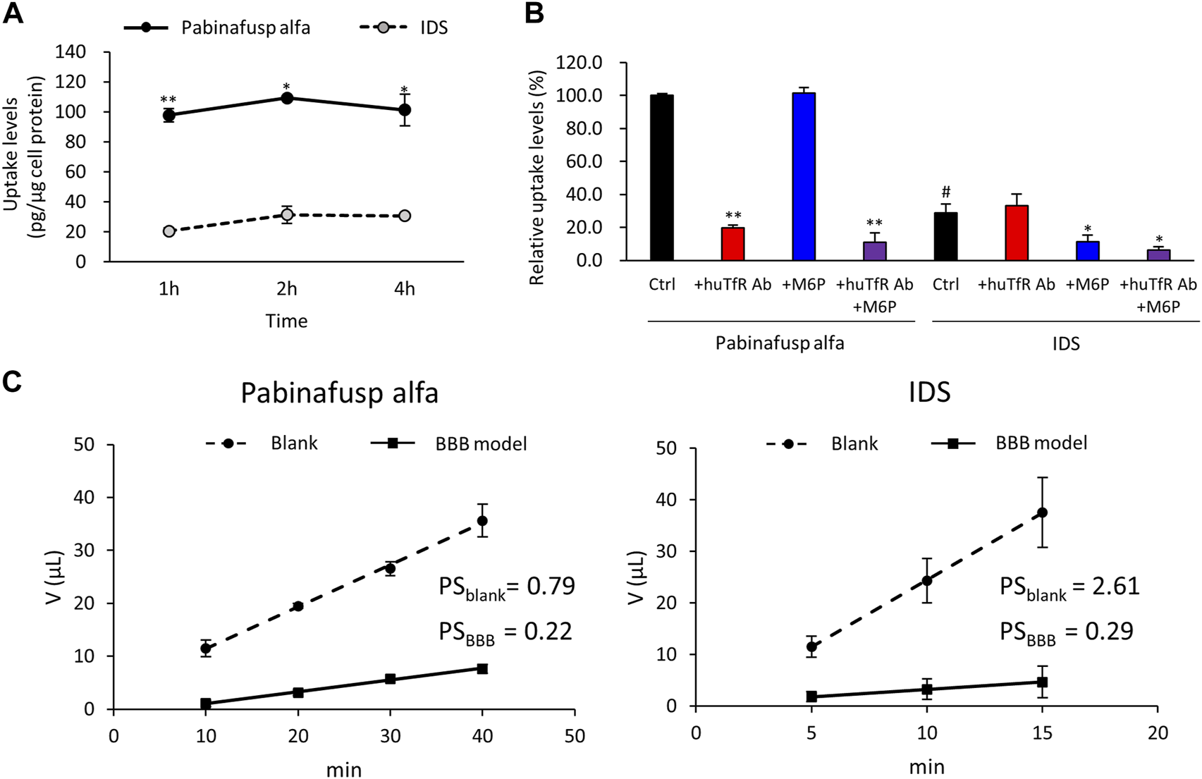 Characterization of pabinafusp alfa uptake profiles in BMECs. 125I-labeled pabinafusp alfa (1 μg/mL) or 125I-labeled IDS (1 μg/mL) uptake in HBMEC/ci18 and their in vitro BBB permeability were examined. (A) The incubation (uptake) periods were set at 1, 2, and 4 h, and the uptake levels (pg/μg cell protein) of pabinafusp alfa (solid line) and IDS (dotted line) are shown as the mean ± S.E. of values obtained from three separate experiments (N = 3), each performed in duplicate (*, p < 0.05; **, p < 0.01; Student’s t-test). The data of each experiment are shown in Supplementary Figure S3A. (B) The uptake levels were examined for 2 h in the presence or absence of huTfR Ab and/or M6P, which serve as competitive inhibitors for TfR and M6PR, respectively (huTfR Ab is the same anti-human TfR antibody as that used in pabinafusp alfa). Data shows the relative uptake level (%) when calculating the pabinafusp alfa uptake levels without inhibitors (Ctrl) as 100%. Data are shown as the mean ± S.E. of values obtained from three separate experiments (N = 3), each performed in duplicate (*, p < 0.05; **, p < 0.01 vs. each of the Ctrl; #, p < 0.05 vs. pabinafusp alfa Ctrl; one-way ANOVA followed by Student’s t-test). The data of each experiment are shown in Supplementary Figure S3A. (C) The permeability experiments using HBMEC/ci18 mono-culture BBB models were conducted for calculating permeability-surface area product values (PS, µL/min) with the incubation periods set at 10, 20, 30, and 40 min for pabinafusp alfa and 5, 10, and 15 min for IDS. The volume (V) of compounds transmitted to the basolateral side (µL) in the BBB model (solid line) and the blank (dotted line) are shown as the mean ± S.E. of values obtained from three separate experiments (N = 3), each performed in duplicate. The PS values obtained from the BBB model and the blank (inserts without HBMEC/ci18 cells) are indicated as PSBBB and PSblank, respectively. The data of each experiment are shown in Supplementary Figure S4.