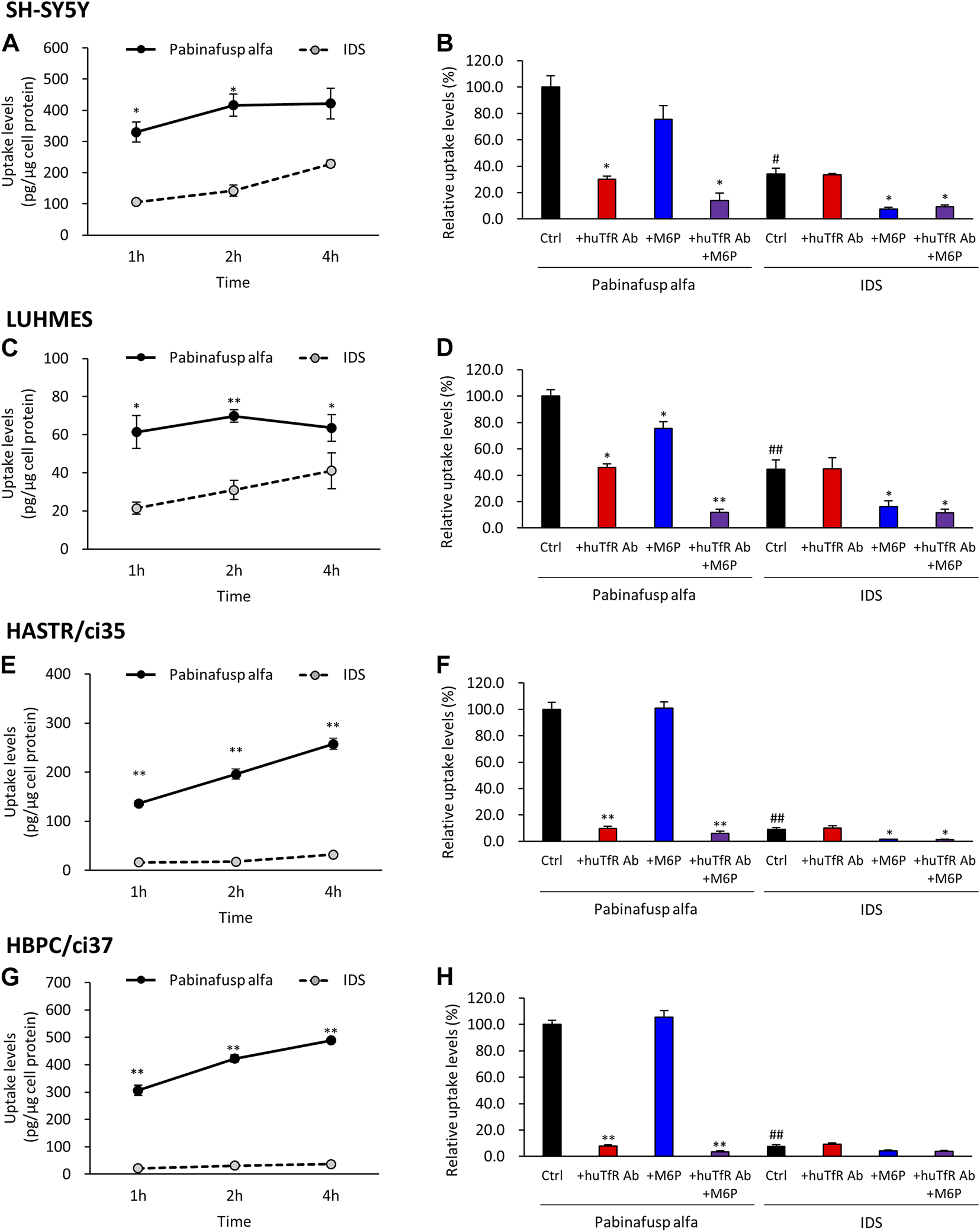 Characterization of pabinafusp alfa uptake profiles in various brain cell types. 125I-labeled pabinafusp alfa (1 μg/mL) or 125I-labeled IDS (1 μg/mL) uptake were examined in differentiated SH-SY5Y (A, B), differentiated LUHMES (C, D), HASTR/ci35 (E, F), and HBPC/ci37 cells (G, H). In (A, C, E, G), the incubation (uptake) periods were set at 1, 2, and 4 h, and the uptake levels (pg/μg cell protein) of pabinafusp alfa (solid line) and IDS (dotted line) are shown as the mean ± S.E. of values obtained from three separate experiments (N = 3), each performed in duplicate (*, p < 0.05; **, p < 0.01; Student’s t-test). In (B, D, F, H), the uptake levels were examined for 2 h in the presence or absence of huTfR Ab and/or M6P, which serve as competitive inhibitors for TfR and M6PR, respectively (huTfR Ab is the same anti-human TfR antibody as that used in pabinafusp alfa). Each data shows the relative uptake level (%) when calculating the pabinafusp alfa uptake levels without inhibitors (Ctrl) as 100%. Data are shown as the mean ± S.E. of values obtained from three separate experiments (N = 3), each performed in duplicate (*, p < 0.05; **, p < 0.01 vs. each of the Ctrl; #, p < 0.05; ##, p < 0.01 vs. pabinafusp alfa Ctrl; one-way ANOVA followed by Student’s t-test). The data of each experiment are shown in Supplementary Figures S5A–8A.