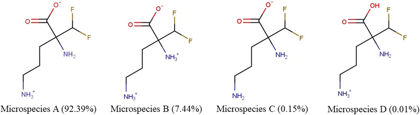 The molecular weight (MW), the log D at pH 7.4 and the gross charge distribution at pH 7.4 of eflornithine and other molecules was obtained from a chemical properties database, MarvinSketch (version 22.9.0, 2022) (MarvinSketch, 2022). The chemical structures and the percentage distribution of the different microspecies at physiological pH was also examined using this database. The predicted physiological charge of the major microspecies of eflornithine and other molecules was also obtained from another specialist database, DrugBank (Wishart et al., 2018). The information was tabulated and the chemical structures of select microspecies presented.