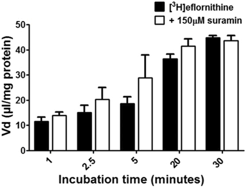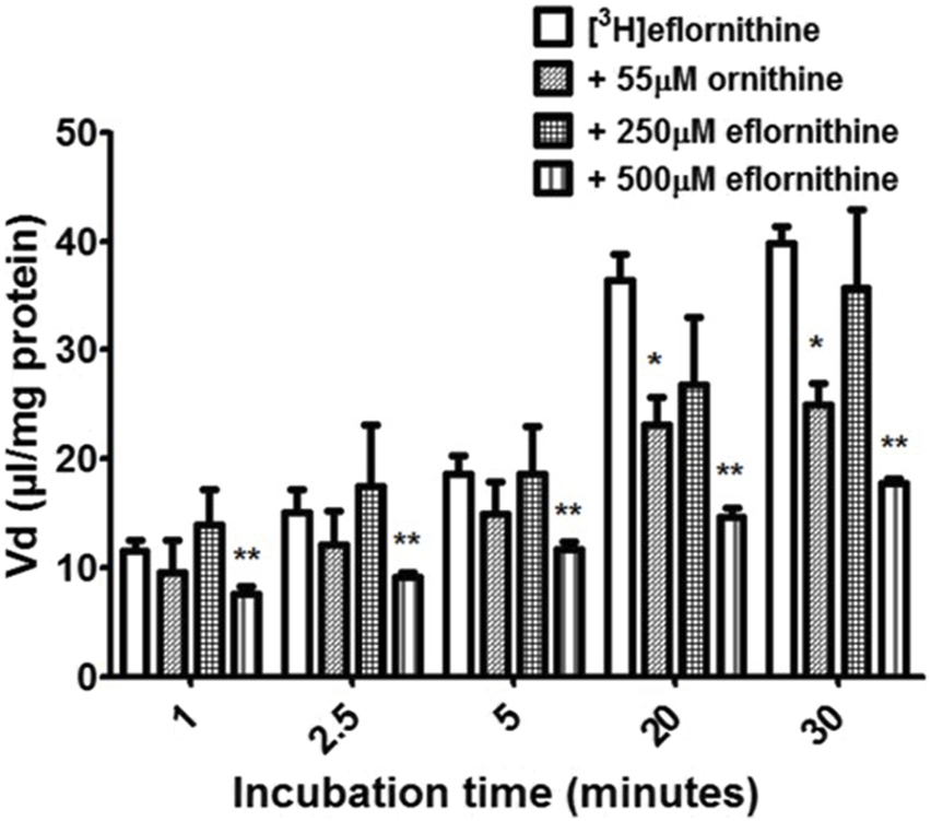 Accumulation of [3H]eflornithine was corrected for [14C]sucrose (Supplementary Figure S3) and observed to be time dependent (Figure 2). The Vd for [3 H]eflornithine (corrected for [14C]sucrose) at 1 min was approximately 12 μL/mg and significantly increased to approximately 40 μL/mg at 30 min (Unpaired Student’s test; p < 0.0001). Figure 2 illustrates that influx of [3H]eflornithine is greater than any efflux (if present) of [3H]eflornithine at all time points.