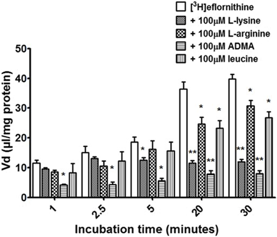 The effect of unlabelled L-lysine, L-arginine, ADMA and leucine on [3H]eflornithine accumulation in hCMEC/D3 cells. The [3 H]eflornithine Vd has been corrected for [14C]sucrose Vd. Significant differences compared to control were observed in hCMEC/D3 cells—*p < 0.05, **p < 0.01. All data expressed as mean ± S.E.M, n = 3–4 (plates), with 6 replicates (wells) per plate. Data were analysed using two-way ANOVA with SigmaPlot 13.
