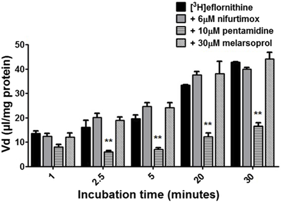 The Vd for [3H]eflornithine is a measure of accumulation and is effectively the sum of the [3H]eflornithine that has entered the cell minus the [3H]eflornithine that has left the cell. A Vd is calculated at each time point. To interpret the data it is understood i) that both the rate of [3H]eflornithine entry into the cell (i.e., cellular influx) and the rate of radiolabelled eflornithine that leaves the cell (i.e., cellular efflux) may be different at each time point. ii) If a test group reduces [3H]eflornithine accumulation, an influx transporter is involved. If a test group increases [3H]eflornithine accumulation, an efflux transporter is involved. iii) The identity of any influx transporter is more likely to be revealed by studying the earliest time point. iv) An absence of an effect by some test groups may be due to an inhibition of both influx and efflux transporters. v) There may be multiple different types of transporter involved in influx and efflux.
