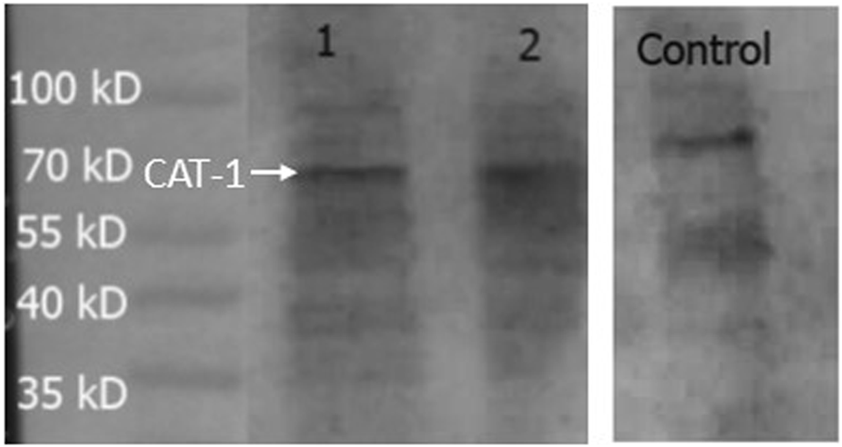 Western blots were performed as follows: hCMEC/D3 cells were grown to confluence in T-75 flasks (Thermo Scientific, United Kingdom) and left for 3–4 days. The flask was then transferred to ice and the medium removed. The cells were then washed twice using ice-cold PBS. Then, 1 mL of ice-cold radio immunoprecipitation assay buffer (Sigma-Aldrich, Dorset, United Kingdom) containing protease inhibitors (10% v/v) (Thermo Scientific, Loughborough, United Kingdom) was added to the flask to lyse the cells. The cell lysate was then transferred to a pre-cooled 1.5 mL Eppendorf tube and left on ice for 20 min. The tubes were then centrifuged at 10,000 rpm for 10 min at 4°C using a Thermo Electron Corporation Heraeus Fresco17 bench-top micro-centrifuge. After centrifugation, the supernatant was transferred to another pre-cooled 1.5 mL Eppendorf and the pellet discarded. The resulting supernatant was taken for Western blot analysis to assess the expression of the transporters, CAT-1 (SLC7A1) and ATB0,+ (SLC6A14) in the cell line. The protein content of the cell lysate was determined using a BCA assay. Samples (30 μg of protein) were then prepared for SDS -PAGE and the proteins separated using NOVEX 4%-20% Tris-glycine mini protein gels (1.0 mm, 12 well) and the XCell SureLockTM Mini-Cell electrophoresis system (Life Technologies, Paisley, United Kingdom). The gel was run at 160 V for 1 h 20 min. After SDS-page, the gels were placed in transfer buffer (Novex Tris-Glycine Transfer Buffer from Thermo Fisher Scientific, Paisley, United Kingdom) for 10 min. The transfer was then run at 100 V for an hour. After the transfer, the membrane was removed and placed in blocking buffer consisting of 5% non-fat dry milk powder (Tesco, United Kingdom) in PBS-Tween (PBS-T, VWR International Ltd., Leicestershire, United Kingdom) on an orbital shaker for an hour to prevent non-specific binding. After blocking, the membrane was washed twice with PBS-T and incubated with the primary antibody for CAT-1 or the primary antibody for ATB0,+ in PBS-T with 5% bovine serum albumin solution (Sigma-Aldrich, Dorset, United Kingdom) overnight at 4°C under constant agitation. The primary antibody for CAT 1 was Rabbit polyclonal (human and mouse) CAT antibody from Abcam (Cat#ab37588; RRID:AB_2190720: dilution 1:250) and for ATB0,+ was Rabbit polyclonal SLC6A14 antibody (human and mouse) from Abcam (Cat#ab99102; RRID:AB_10696963: dilution 1:2000). The primary antibody PBS-T with 5% bovine serum albumin solution was then removed, the membrane washed in PBS-T and then incubated with the secondary antibody (Goat anti-rabbit IgG HRP conjugated Abcam ab6721: RRID:AB_955447, dilution 1:2000) for 1 h at room temperature.
