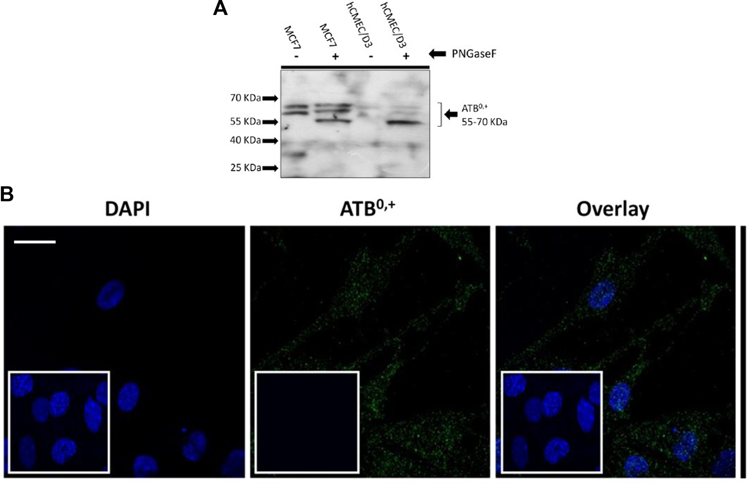 Since CAT-1 and ATB0,+ can be in their glycosylated forms, N-linked-glycopeptide-(N-acetyl-beta-D-glucosaminyl)-L-asparagine amidohydrolase (PNGaseF) enzyme was used to deglycosylate the proteins. PNGaseF was purchased from New England Biolabs, Hertfordshire, United Kingdom (P0704S). Human liver hepatocellular carcinoma cell (HepG2) lysates or the human wild-type MCF-7 cell lysates were used as a positive control. Samples containing 30 μg of protein were loaded into each lane.