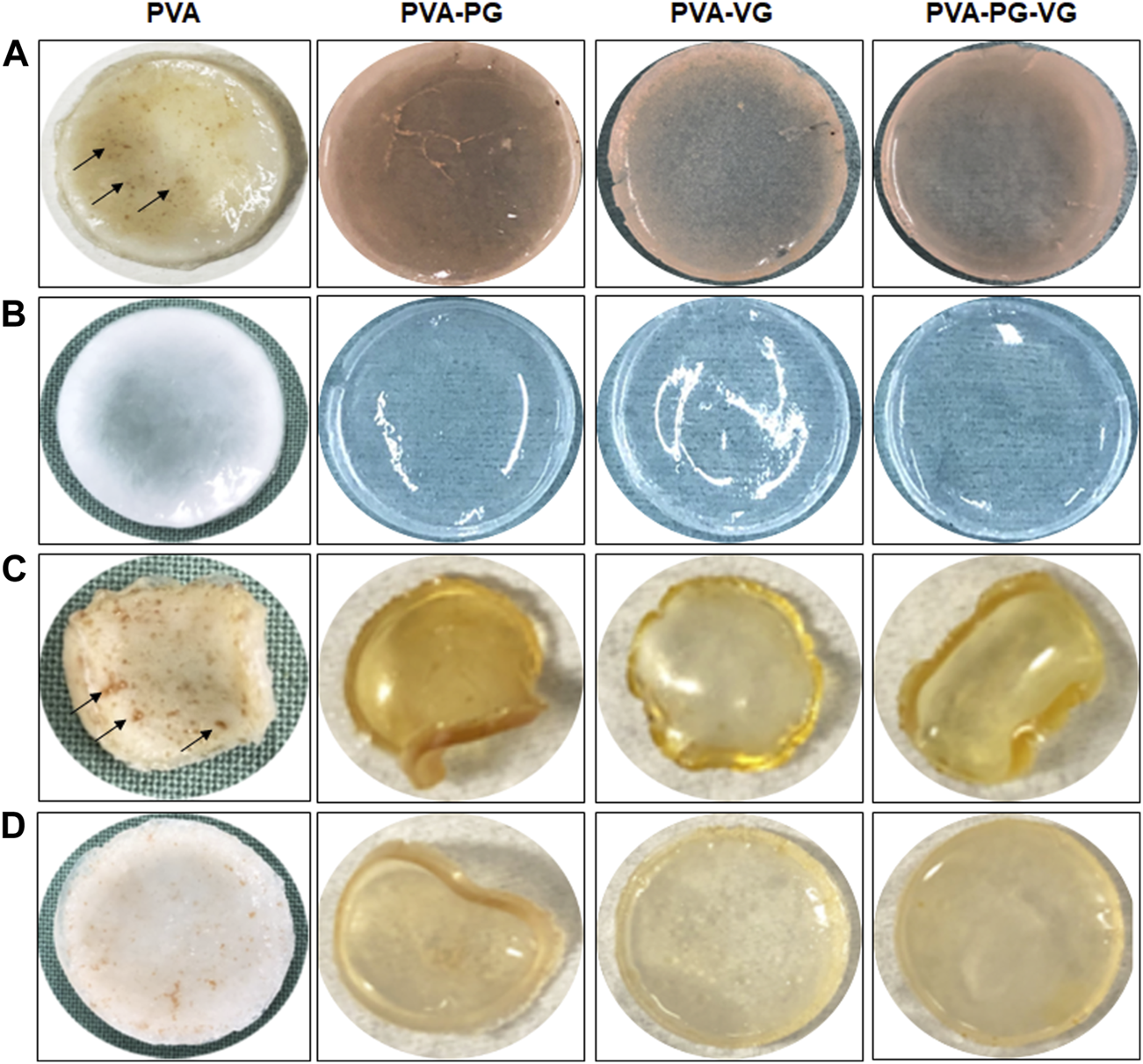 As shown in Table 1, both PG and VG significantly affected the hydrogel swelling ratio, compared to the PVA alone. This ratio goes from 346% ± 5.1% with the PVA to 86.6% ± 1.1% with the PVA-PG, 42.9% ± 0.9% with the PVA-VG, and 79.0% ± 0.6% with the PVA-PG-VG. It is noted that the PVA-PG absorbed more water than the PVA-VG. However, in the PVA-PV-VG, the absorption level was comparable to that obtained with the PVA-PG. PVA chains are pushed together by water crystals to form a physically crosslinked network during repeated freeze-thaw processes (Wang et al., 2021), leaving void spaces within the polymer network (Alshangiti et al., 2023).